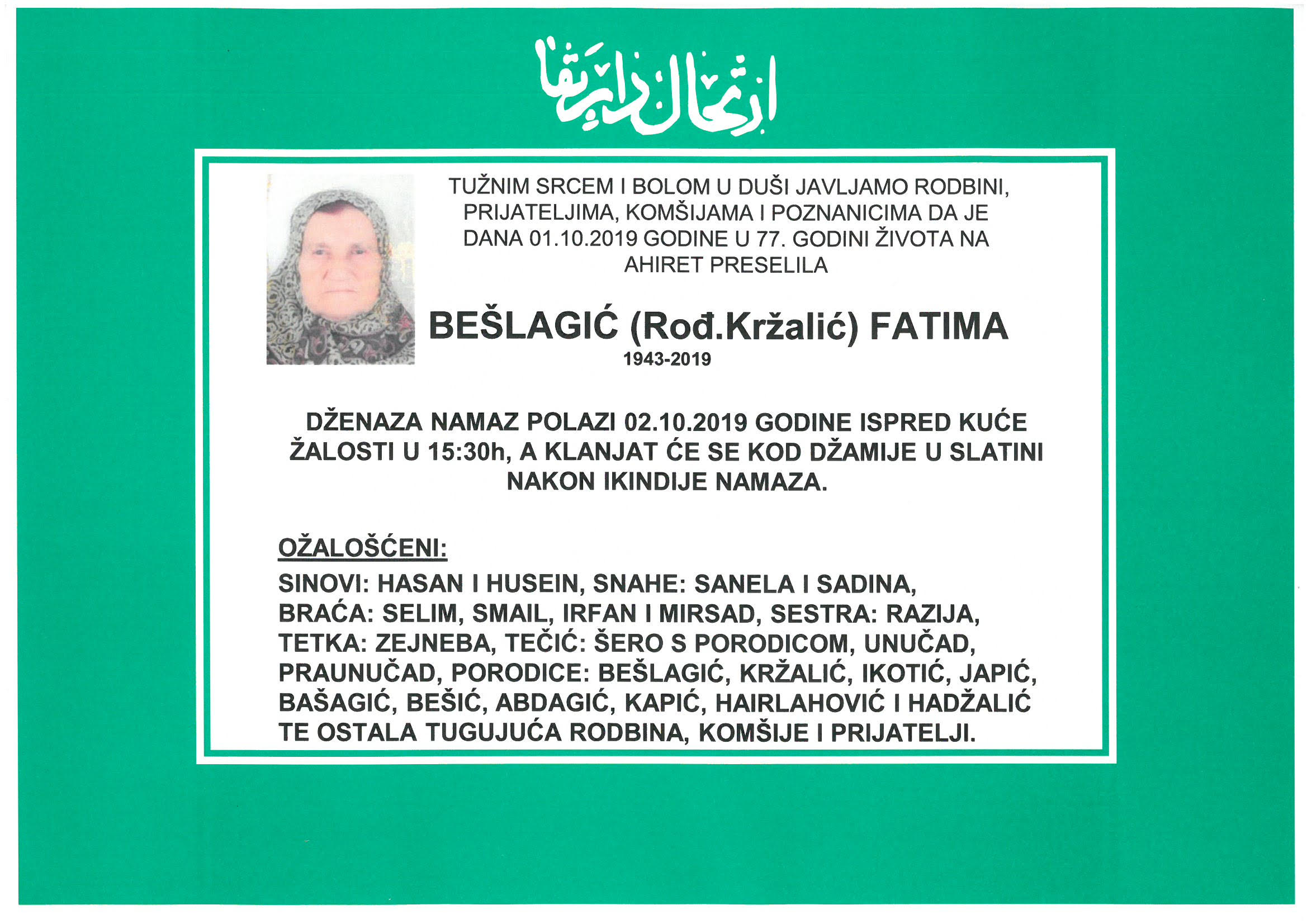 Tužnim srcem i bolom u duši javljamo rodbini, prijateljima, komšijama i poznanicima da je dana 01.10.2019. godine u 77.godini života na Ahiret preselila Bešlagić (rođ.Kržalić) Fatima. Dženaza namaz polazi 02.10.2019. godine ispred kuće žalosti u 15:30h, a klanjat će se kod džamije u Slatini nakon ikindije namaza.
