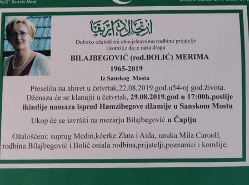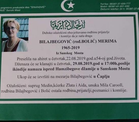 Tužnim srcem i bolom u duši javljamo rodbini, komšijama, prijateljima i poznanicima da dana 22.08.2019. g. u 54-oj godini na Ahiret preselila naša draga Bilajbegović (rođ. Bolić) Merima .