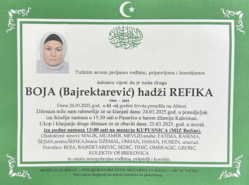 Tužna srca i s bolom u dušu obavlještavamo da je preselila Boja (Bajrektarević) hadži Refika na ahiret 24.03.2025. god. u 61. godini života.