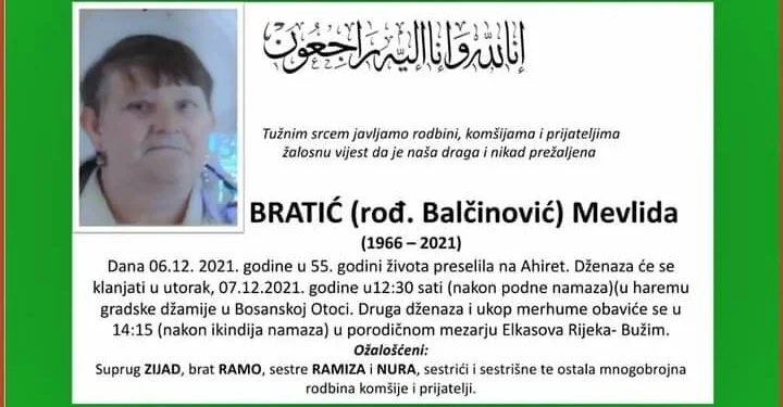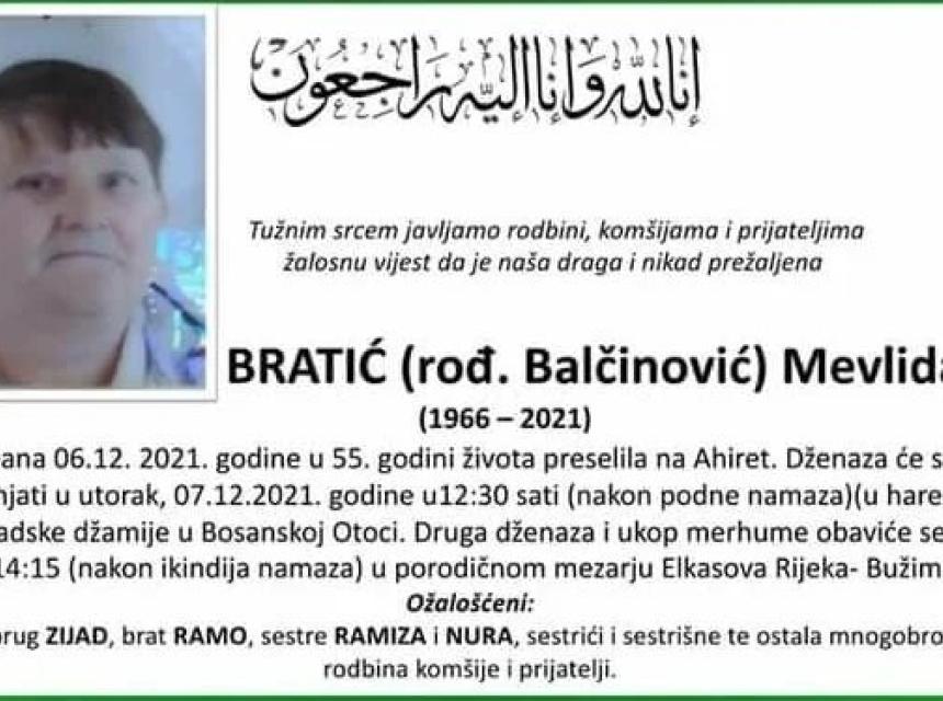 Tužnog srca i s bolom u duši obavještavamo rodbinu, komšije i prijatelje da je naša draga Bratić (rođ. Balčinović) Mevlida, dana 06.12.2021. godine, u 55-oj godini života, preselila na Ahiret.