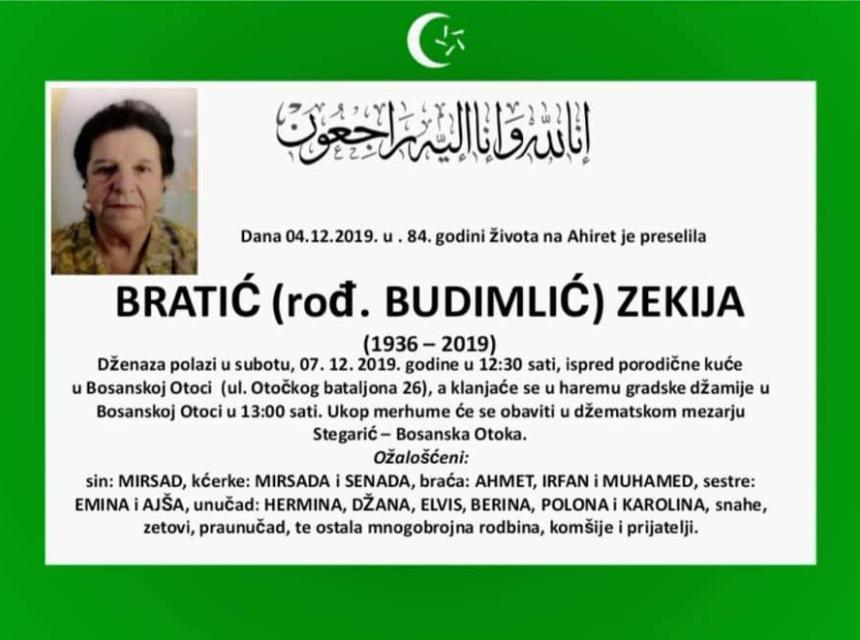 Sa tužnim srcem i bolom u duši, javljamo rodbini i prijateljima da je naša draga Bratić (rođ. Budimlić) Zekija, dana 04.12.2019. godine u 84-oj godini života preselila na Ahiret.