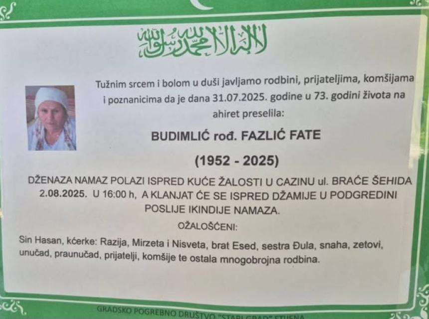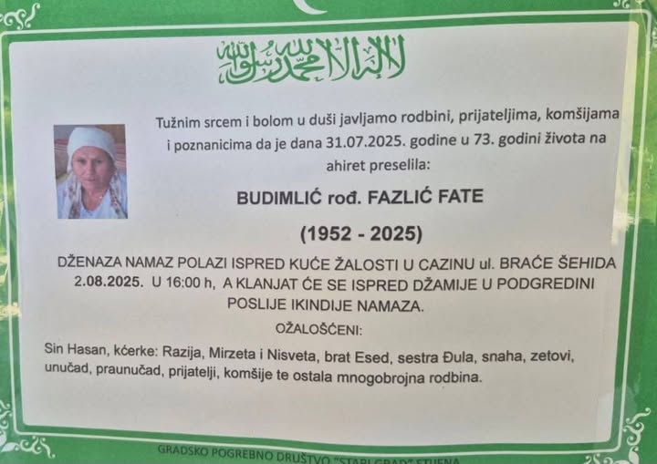 Tužnim srcem i bolom u duši javljamo rodbini, prijateljima, komšijama i poznanicima da je dana 31.07.2025. godine u 73. godini života na ahiret preselila: