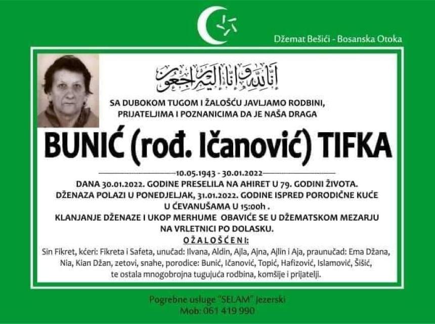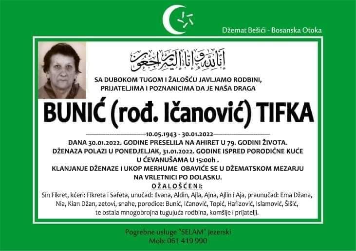 Tužnog srca i s bolom u duši obavještavamo rodbinu, komšije i prijatelje da je naša draga Bunić (rođ. Ičanović) Tifka, dana 30.01.2022. godine, u 79-oj godini života, preselila na Ahiret.