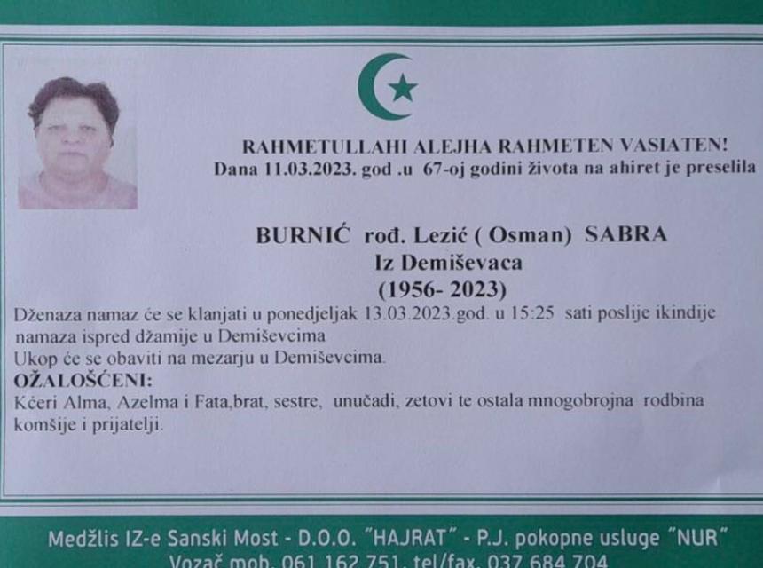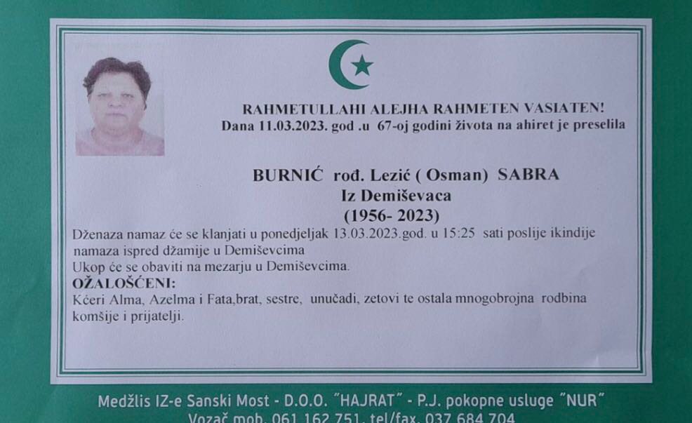 Tužnim srcem i bolom u duši javljamo rodbini, prijateljima i komšijama da je naša draga Burnić rođ. Lezić (Osman) Sabra, dana 11.03.2023. godine u 67-oj godini života, preselila na Ahiret.