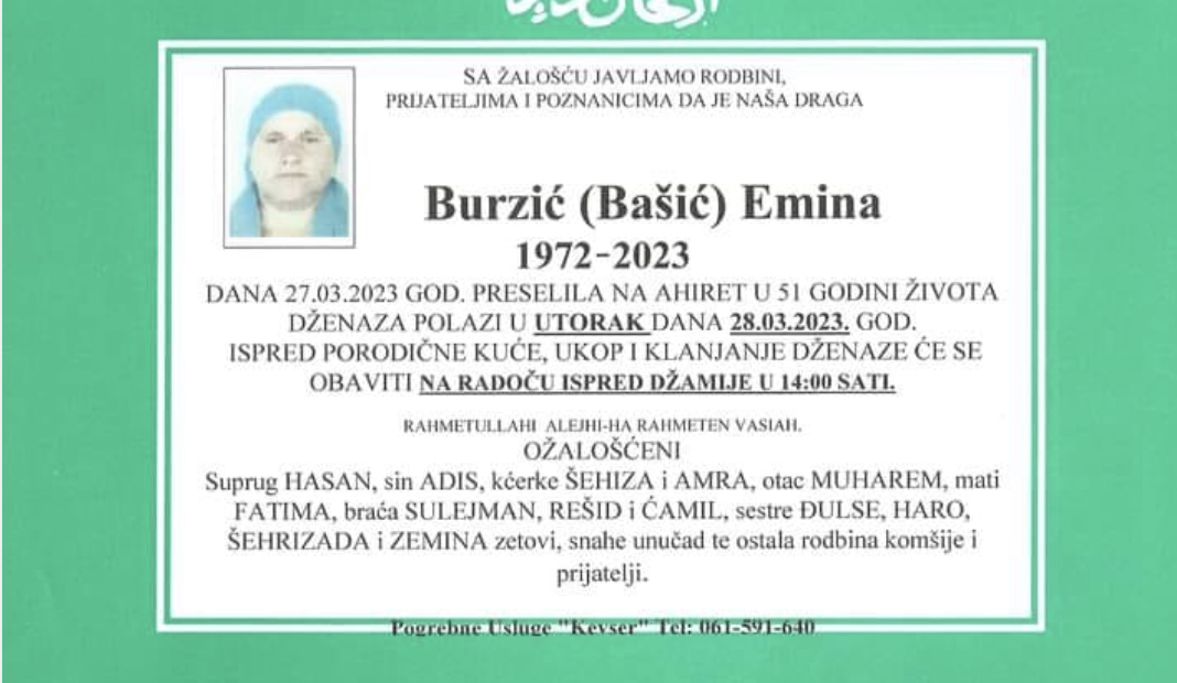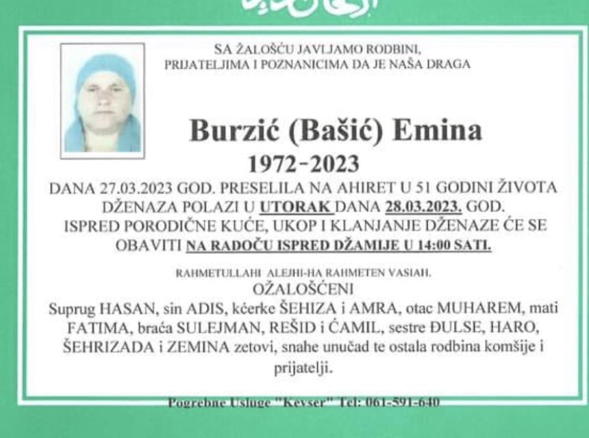 Tužnim srcem javljamo rodbini, prijateljima i poznanicima da je naša draga Burzić (Bašić) Emina, dana 27.03.2023. godine u 51-oj godini života na Ahiret preselila.