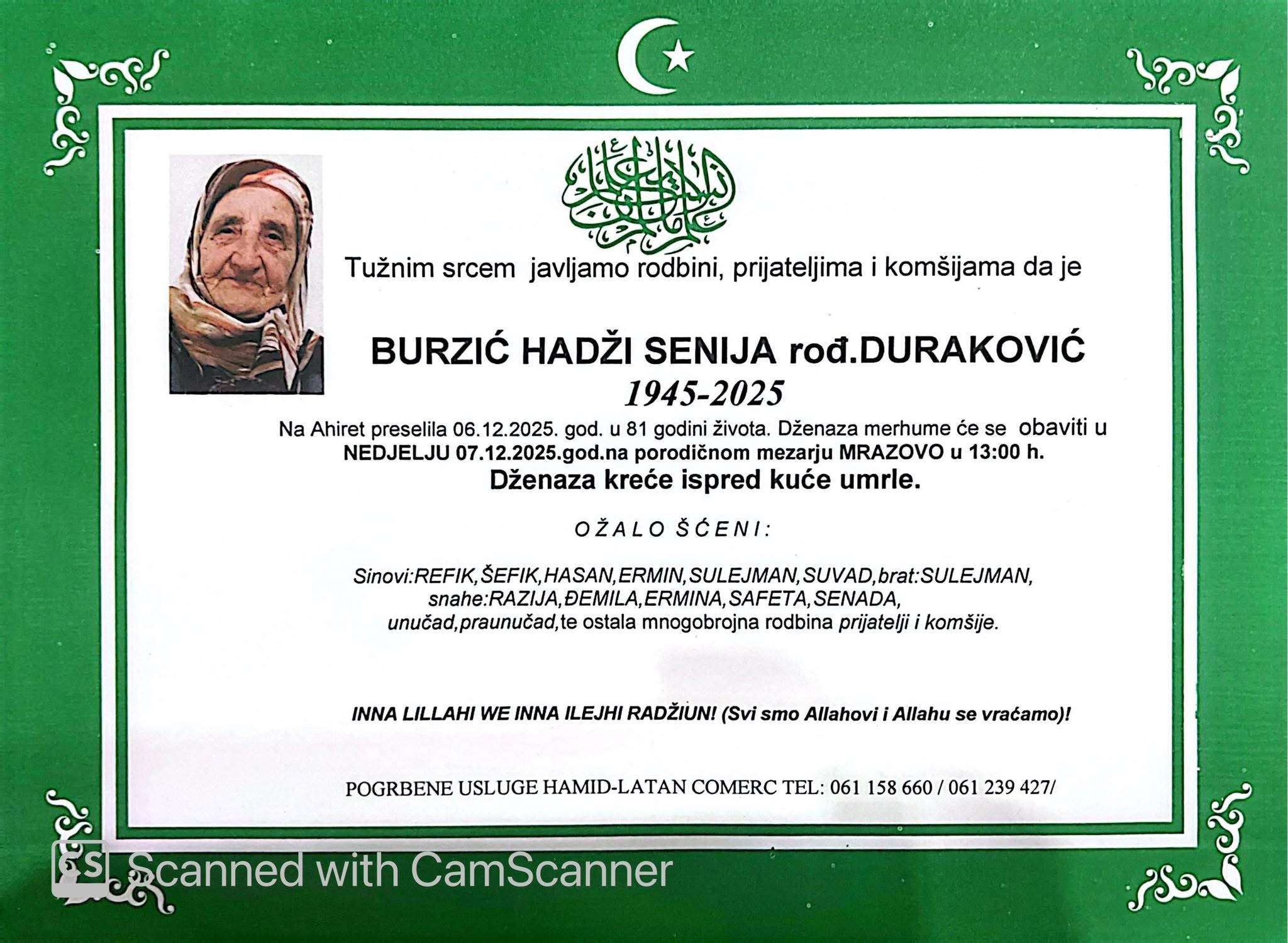 Dženaza merhume će se obaviti u nedjelju 07.12.2025. godine na porodičnom mezarju Mrazovo u 13:00 h.