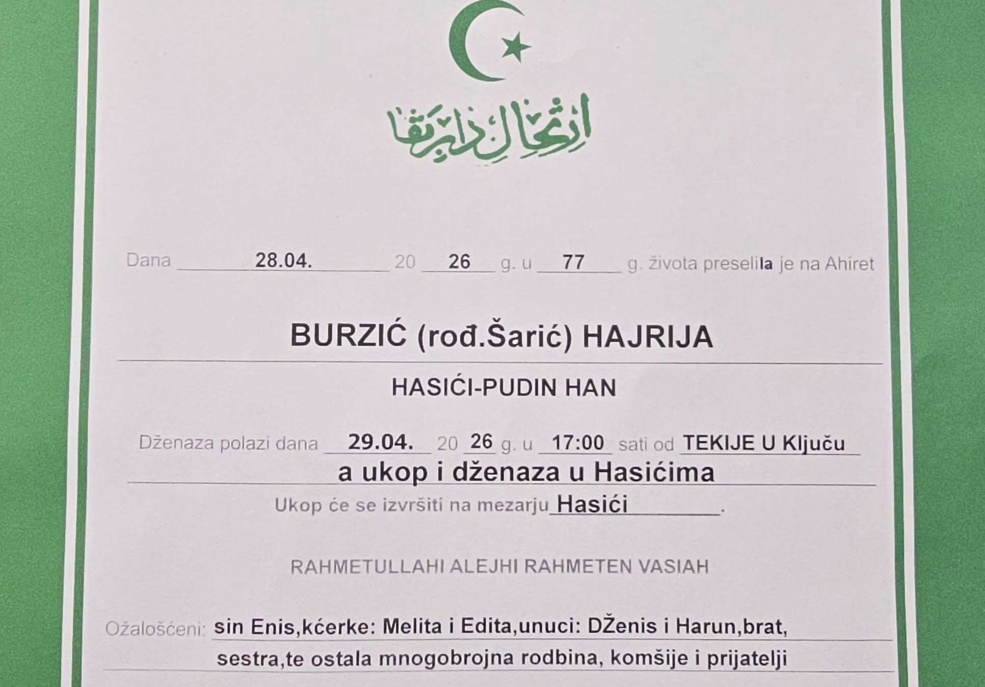 Dženaza polazi dana 29.04.2026. g. u 17:00 sati od Tekije u Ključu,