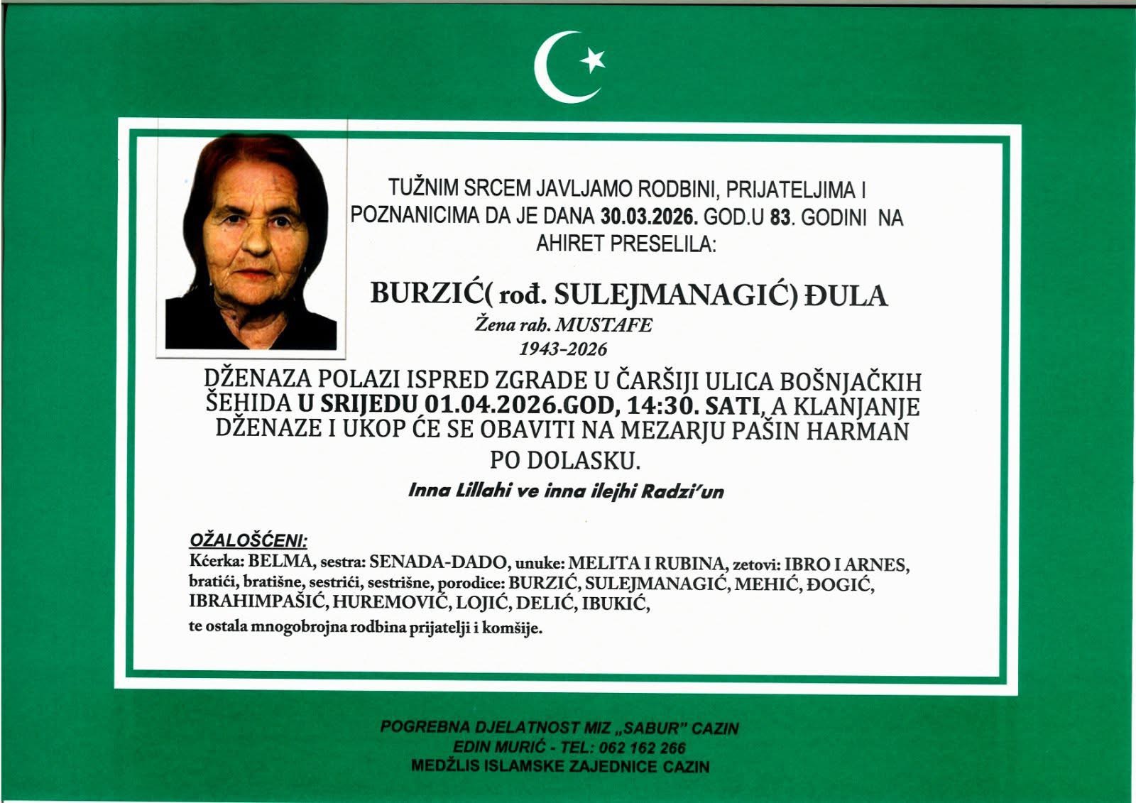 Dženaza polazi ispred zgrade u čaršiji, Ulica Bošnjačkih šehida, u srijedu 01.04.2026. godine u 14:30 sati, a klanjanje dženaze i ukop će se obaviti na mezarju Pašin Harman po dolasku.