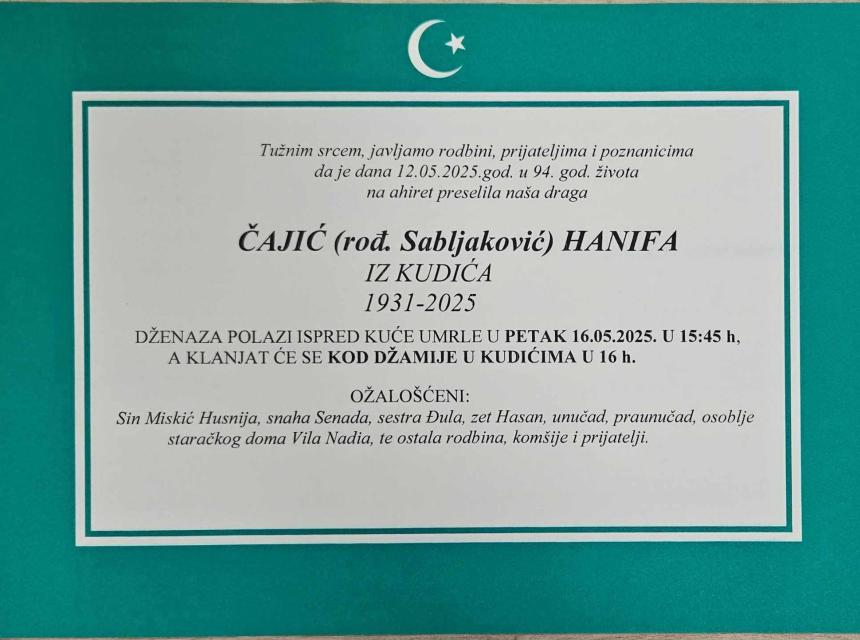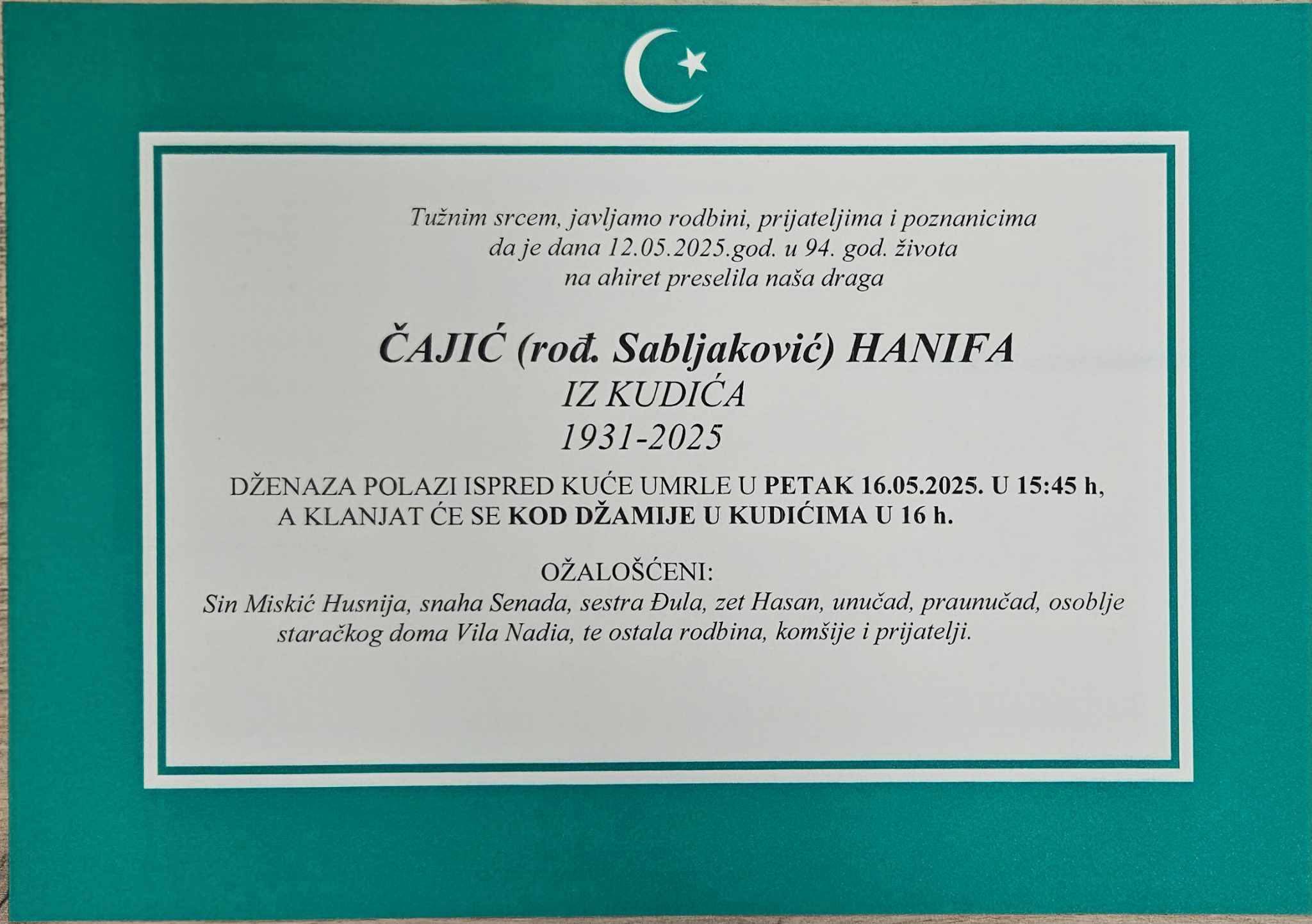 Tužnim srcem i bolom u duši javljamo rodbini, prijateljima i komšijama da je naša dragaČajić (rođ. Sabljaković) Hanifa, dana 12.05.2025. godine u 94-oj godini života, preselila na Ahiret.
