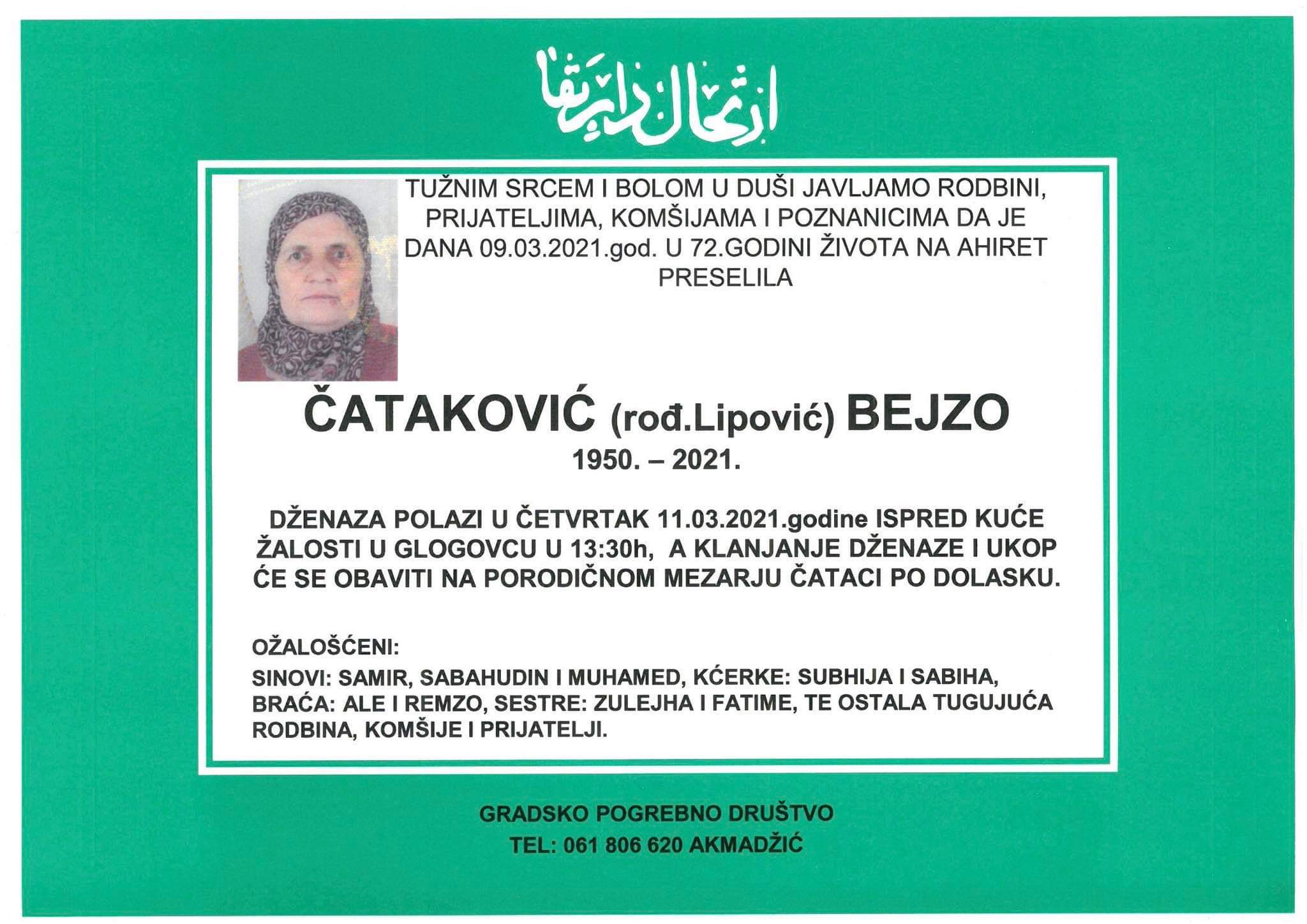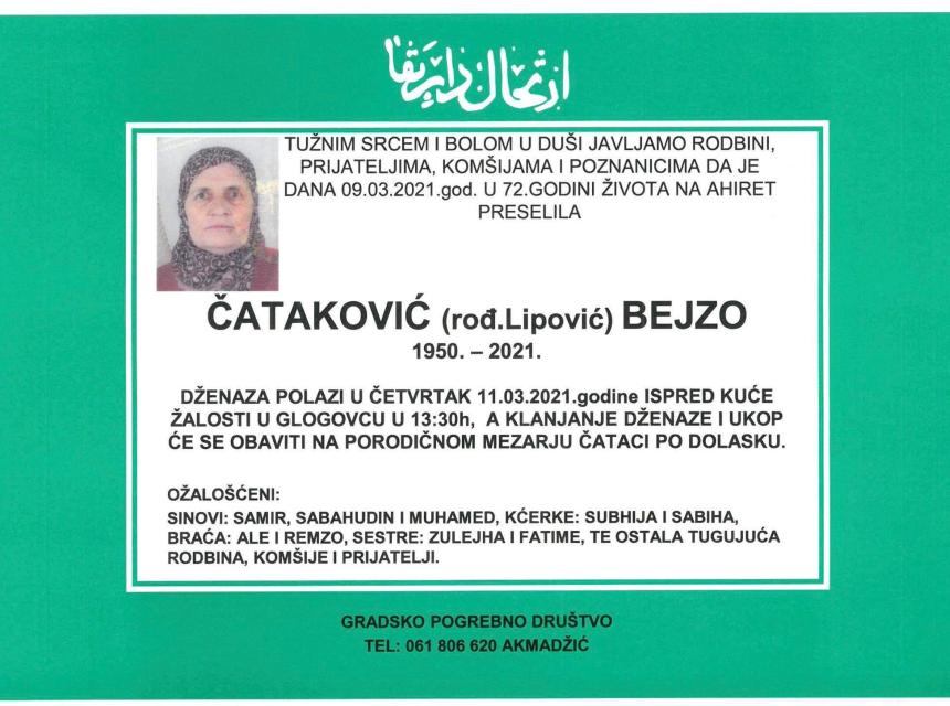 Tužnog srca i s bolom u duši obavještavamo rodbinu, komšije i prijatelje da je naša draga Čataković (rođ. Lipović) Bejzo, dana 09.03.2021. godine, u 72-oj. godini života, preselila na Ahiret.
