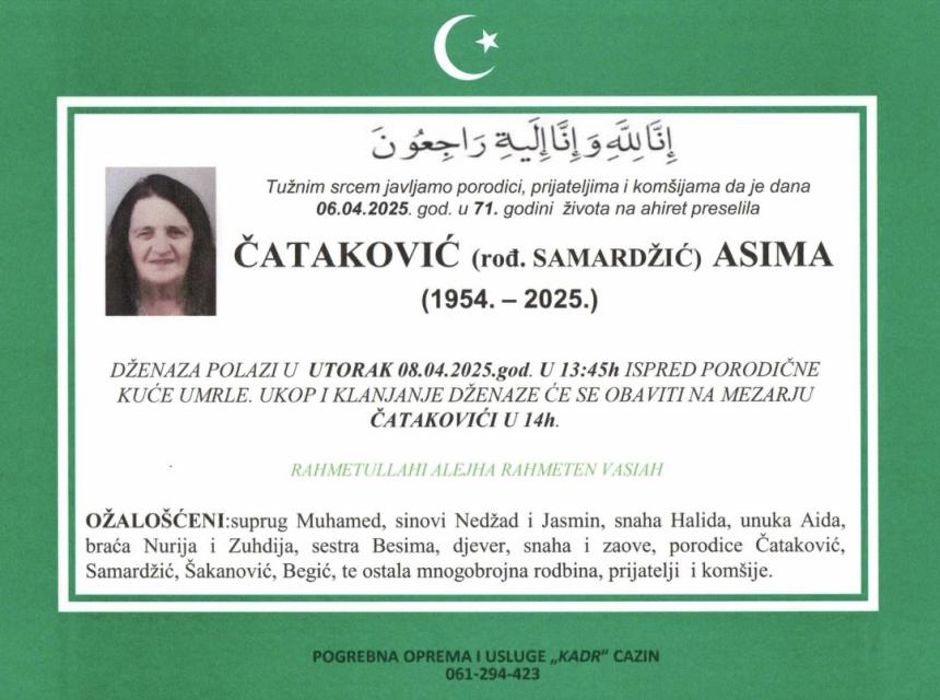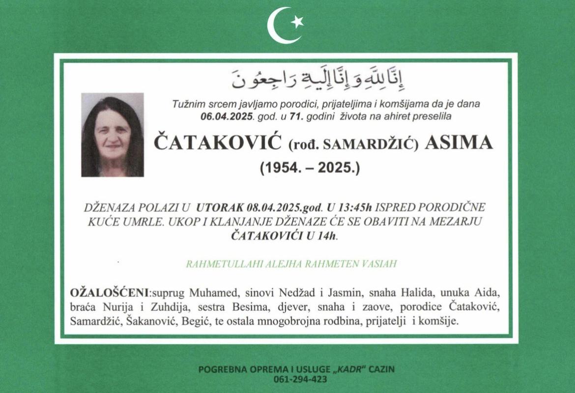 Dženaza polazi u utorak 08.04.2025. godine ispred porodične kuće u 13:45h. Ukop i klanjanje će se obaviti na mezarju ČATAKOVIĆI u 14:00h.