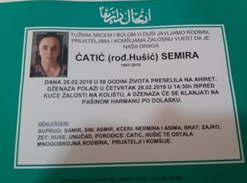 Tužnim srcem i bolom u duši, javljamo rodbini, komšijama i prijateljima, da je na Ahiret 26.02.2019.g. u 58.-oj godini života preselila Ćatić (rođ. Hušić) Semira.