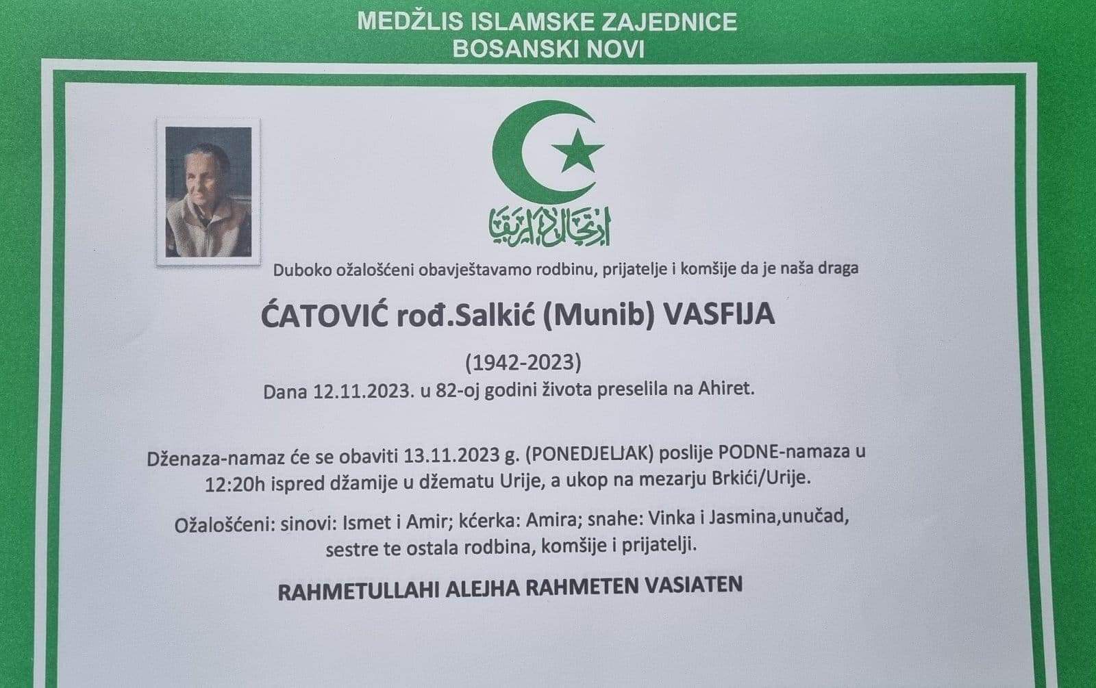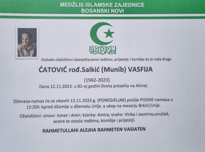 Tuznim srcem javljamo rodbini, prijateljima i komšijama žalosnu vijest da je naša draga Ćatović r.Salkić (Munib) Vasfija dana: 12.11.2023.god. u 82-oj godini života preselila na Ahiret.