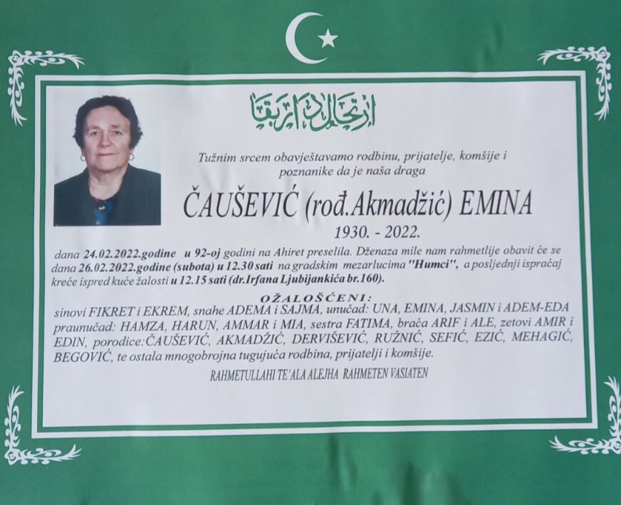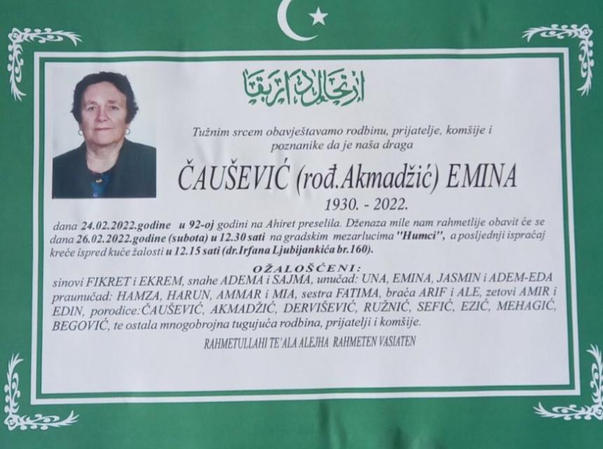 Tužnog srca i s bolom u duši obavještavamo rodbinu, komšije i prijatelje da je naša draga Čaušević (rođ. Akmadžić) Emina, dana 24.02.2022. godine, u 92-oj godini života, preselila na Ahiret.