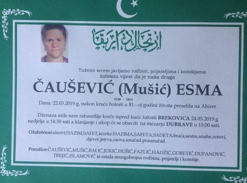 Tužnim srcem i bolom u duši javljamo rodbini, prijateljima i komšijama žalosnu vijest da je u 81-oj. godini života na Ahiret preselila Čaušević (rođ.Mušić) Esma.