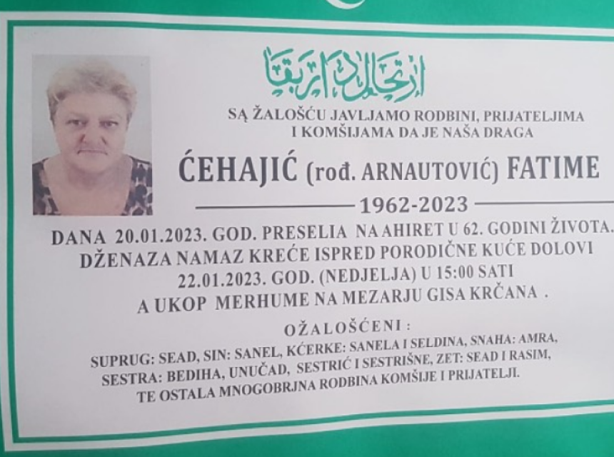 Sa žalošću javljamo rodbini, prijateljima i komšijama da je naša draga Ćehajić (rođ. Arnautović) Fatime dana 20.01.2023. godine preselila na Ahiret u 62. godini života.