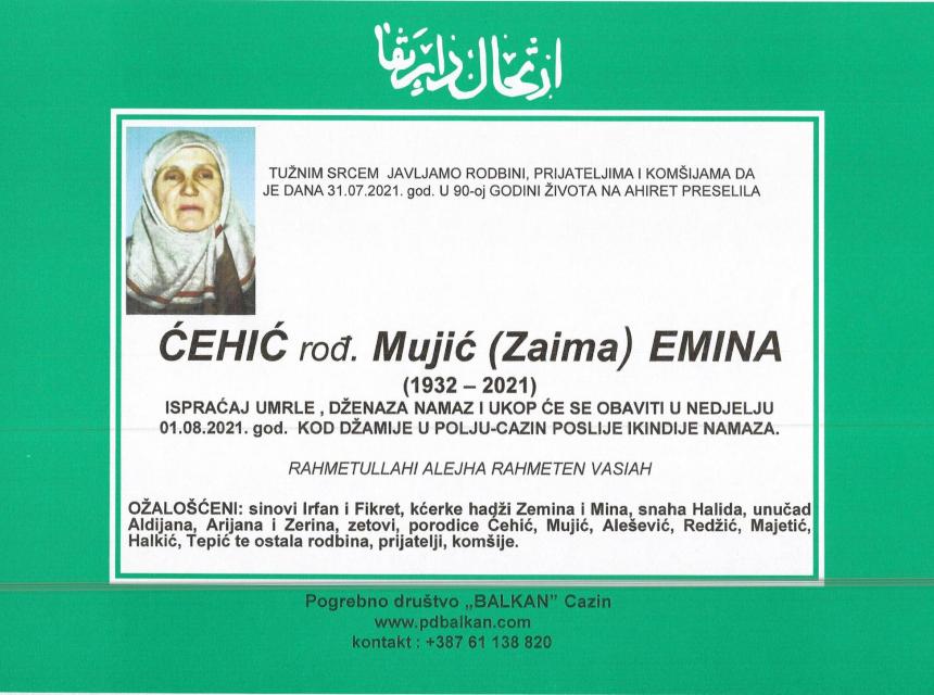 Tužnog srca i s bolom u duši obavještavamo rodbinu, komšije i prijatelje da je naša draga Ćehić rođ. Mujić (Zaima) Emina dana 31.07.2021. godine, u 90. godini života, preselila na ahiret.