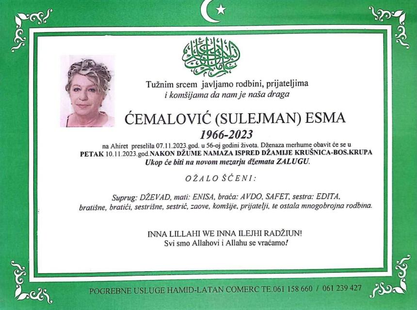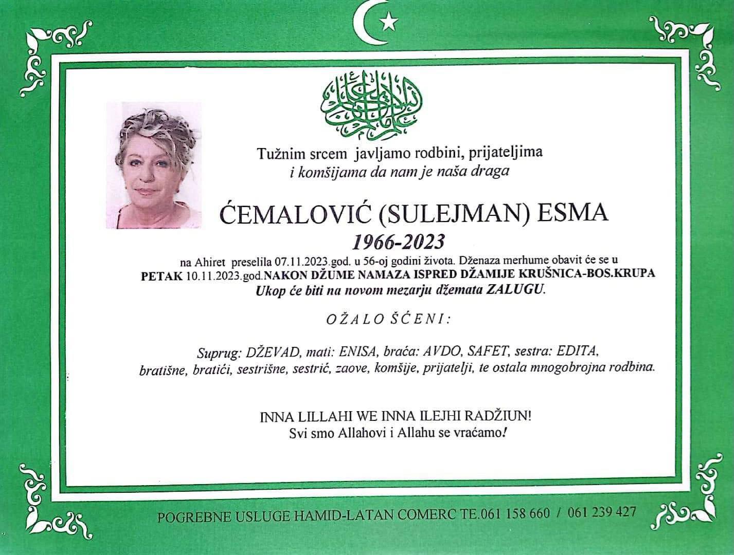 Tužnim srcem javljamo rodbini, prijateljima i poznanicima da je dana 07.11.2023. god u 56. godini života na ahiret preselila Ćemalović (Sulejman) Esma.