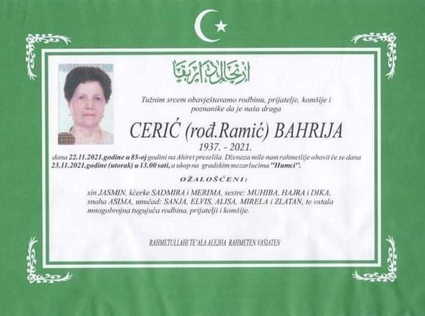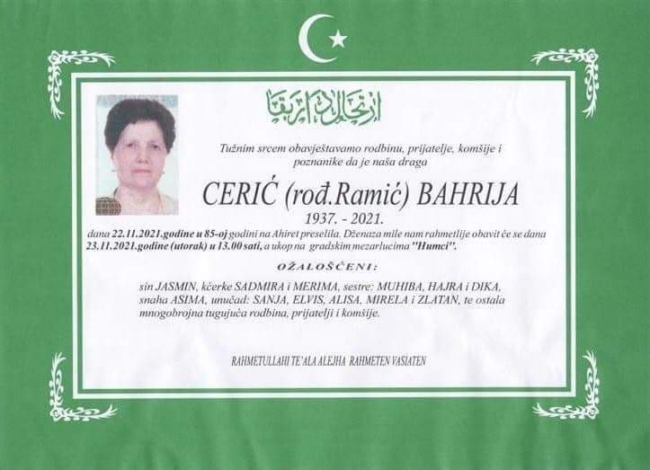 Tužnog srca i s bolom u duši obavještavamo rodbinu, komšije i prijatelje da je naša draga Cerić (rođ. Ramić) Bahrija dana 22.11.2021. u 85. godini života preselila na ahiret.