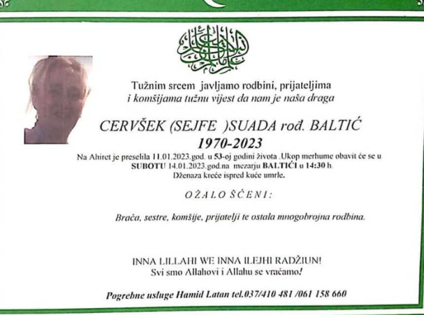 Tužnim srcem javljamo rodbini, prijateljima i komšijama tužnu vijest da nam je naša draga Cervšek (Sejfe) Suada rođ. Baltić na Ahiret je preselila 11.01.2023. godine u 53-oj godini života.