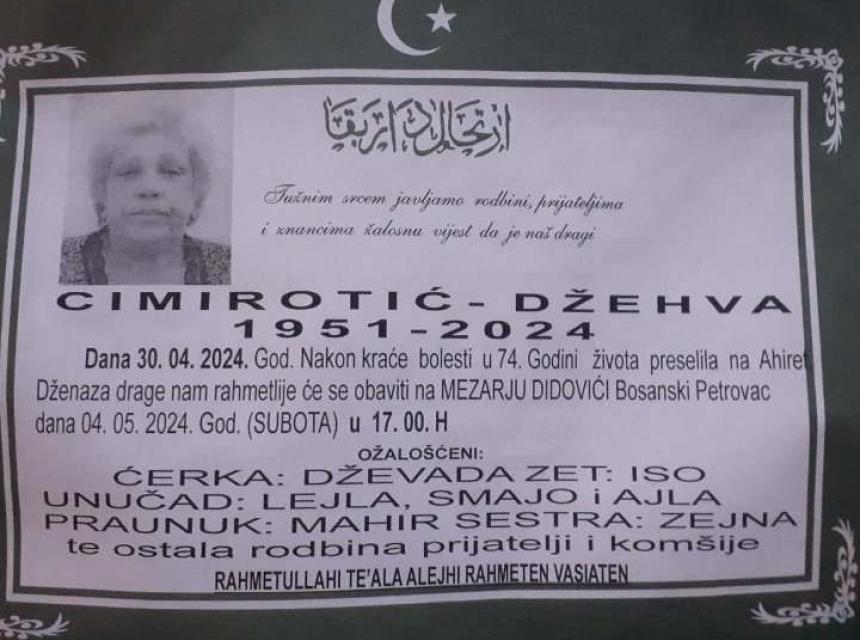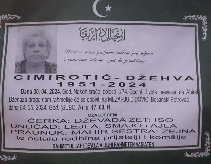 Tužnim srcem i bolom u duši javljamo rodbini, prijateljima i komšijama da je dana 30.04.2024. godine nakon kraće bolesti u 74-oj godini života iznenada na Ahiret preselila Cimirotić Džehva.