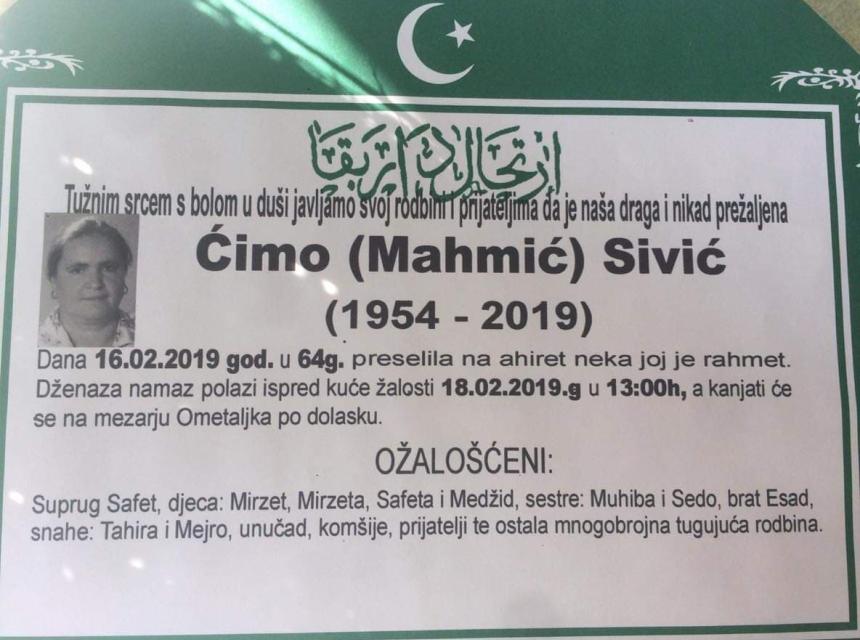 Tužnim srcem s bolom u duši javljamo rodbini i prijateljima da je naša draga i nikad preželjena Ćimo (Mahmić) Sivić dana 16.02.2019 god. u 64g. preselila na Ahiret neka joj je rahmet.