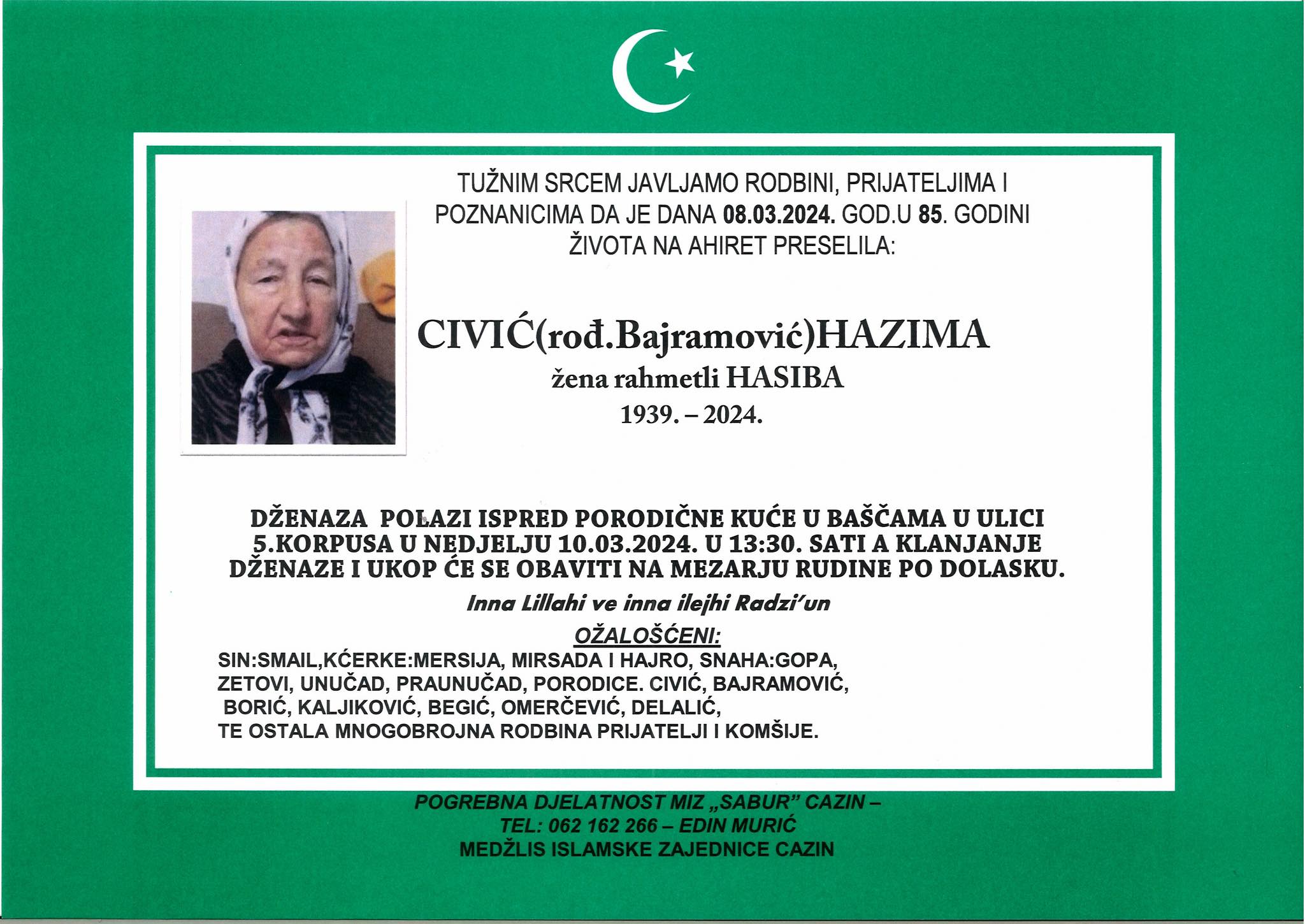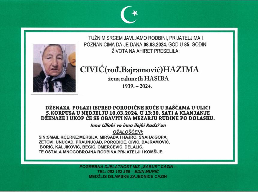 Tužnim srcem javljamo rodbini, prijateljima, komšijama i poznanicima žalosnu vijest da nam je naša draga Civić (rođ. Bajramović) Hazima dana 08.03.2024. godine u 85. godini života preselila na Ahiret.