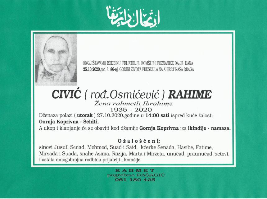 Tužnog srca i s bolom u duši obavještavamo rodbinu, komšije i prijatelje da je naša draga Civić (rođ Osmićević) Rahime 25. oktobra 2020. godine, u 86. godini života, preselila na Ahiret.