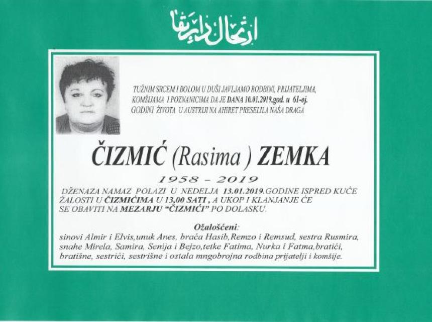 Tužnim srcem javljamo rodbini, prijateljima i komšijama da je dana 10.01.2019. god. u 61. godini života na Ahiret preselila Čizmić (Rasim) Zemka.