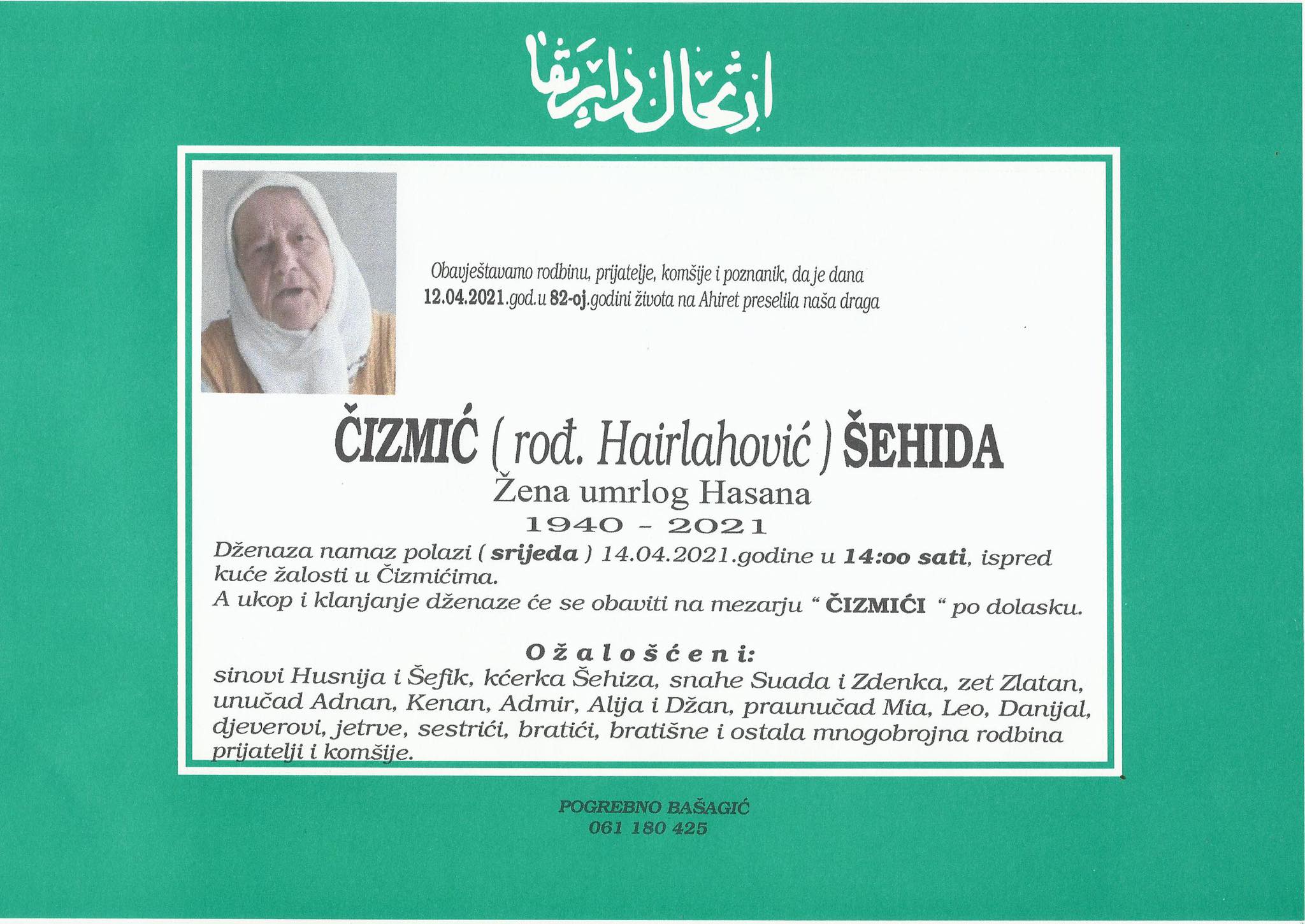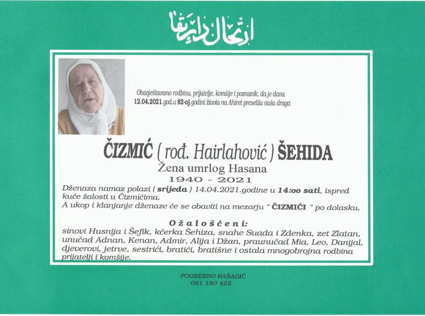 Tužnog srca i s bolom u duši obavještavamo rodbinu, komšije i prijatelje da je naša draga Čizmić (rođ. Hairlahović) Šehida žena umrlog Hasana, dana 12.04.2021 godine, u 82-oj godini života, preselila na Ahiret.