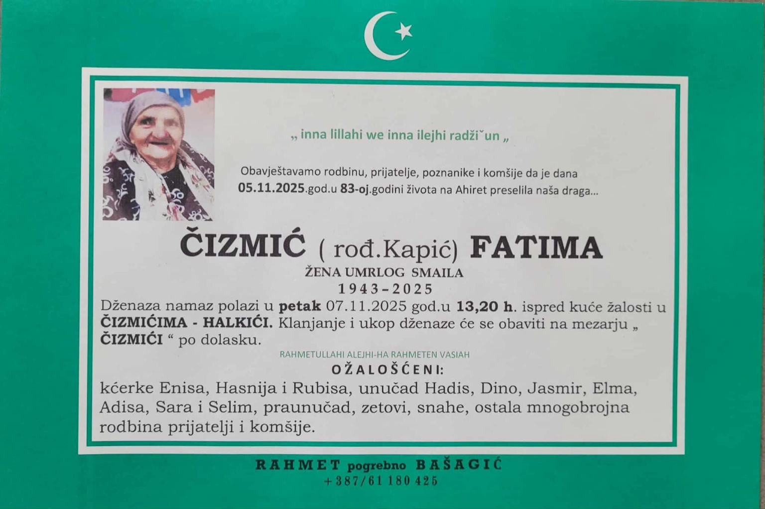 Dženaza namaz polazi u petak, 07.11.2025. godine u 13:20 sati ispred kuće žalosti u ČIZMIĆIMA – HALKIĆI.
