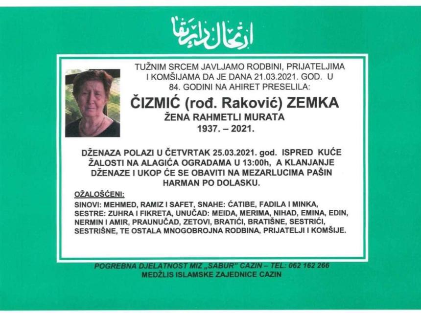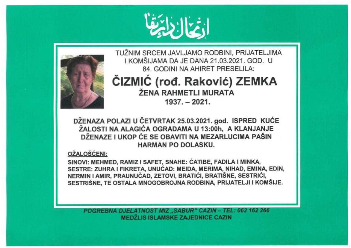 Tužnog srca i s bolom u duši obavještavamo rodbinu, komšije i prijatelje da je naša draga Čizmić (rođ. Raković) Zemka, dana 21.03.2021 godine, u 84-oj godini života, preselila na Ahiret.