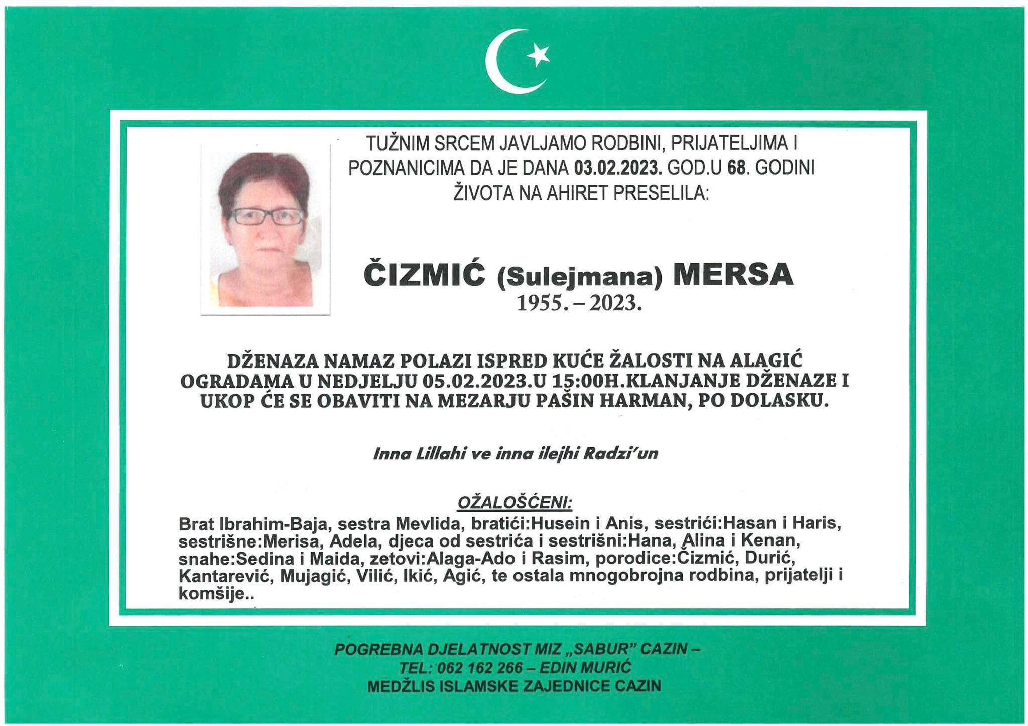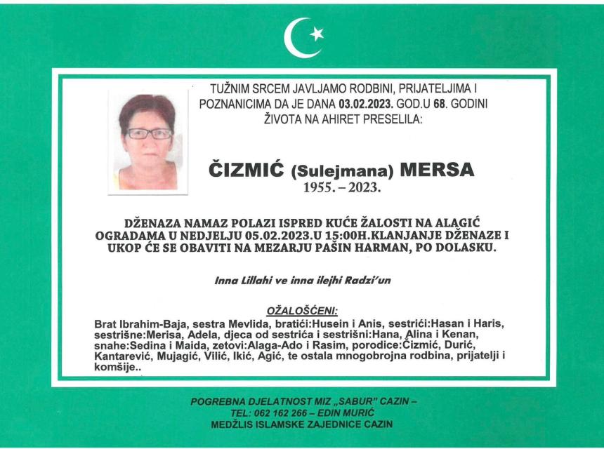 Tužnim srcem i bolom u duši javljamo rodbini, prijateljima, komšijama i poznanicima da je dana 03.02.2023. godine u 68-oj godini života na Ahiret preselila Čizmić (Sulejmana) Mersa.