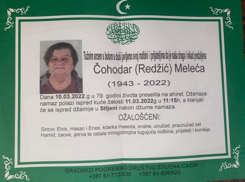 Tužnog srca i s bolom u duši obavještavamo rodbinu, komšije i prijatelje da je naša draga Čohodar (Redžić) Meleća, dana 10.03.2022. godine, u 79-oj godini života, preselila na Ahiret.