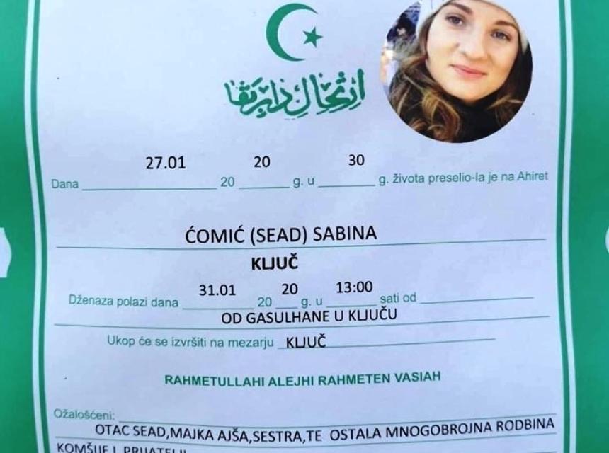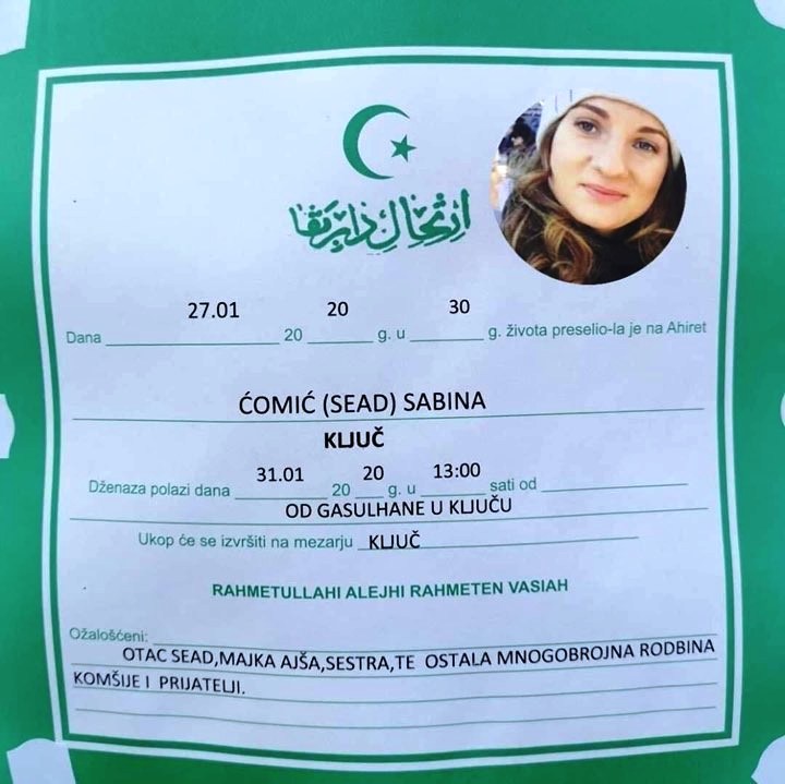 Tužnim srcem i bolom u duši obavještavamo rodbinu, prijatelje i komšije da je naša draga Ćomić (Sead) Sabina preselila na Ahiret dana 27.01.2020. godine u 30. godini života.