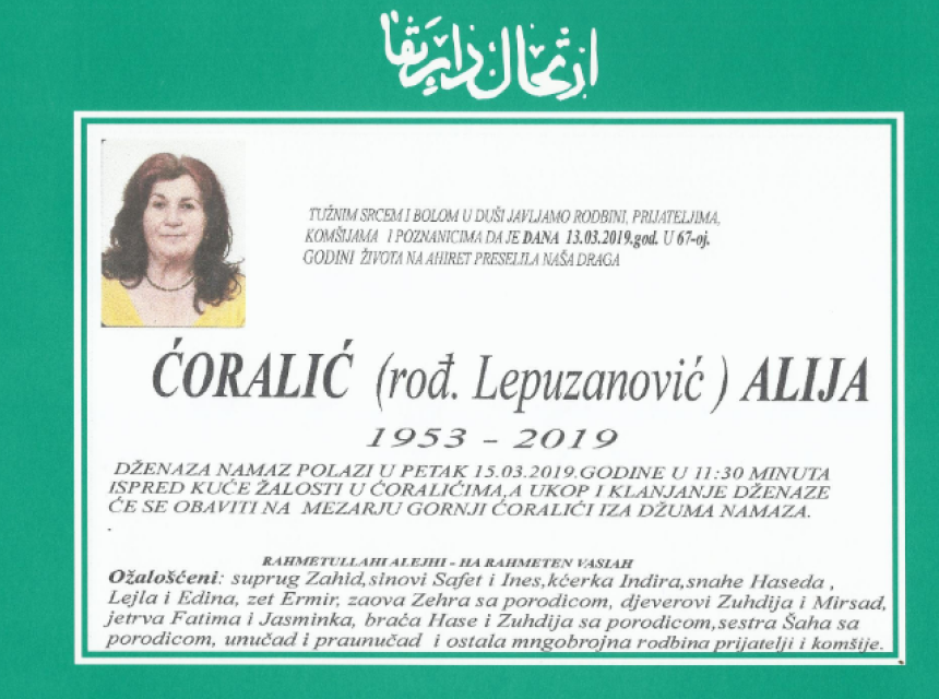 Tužnim srcem javljamo rodbini, prijateljima i komšijama da je naša draga Ćoralić (rođ. Lepuzanović) Alija dana 13.03.2019. godine u 67-oj godini preselila na Ahiret.