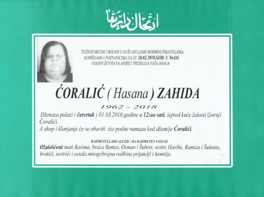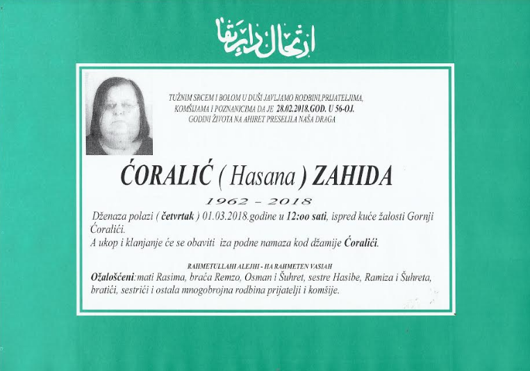 Tužnim srcem i bolom u duši javljamo rodbini, prijateljima, komšijama i poznanicima da je 28.02.2018. godine u 56-oj godini života na Ahiret preselila naša draga Ćoralić (Hasana) Zahida.