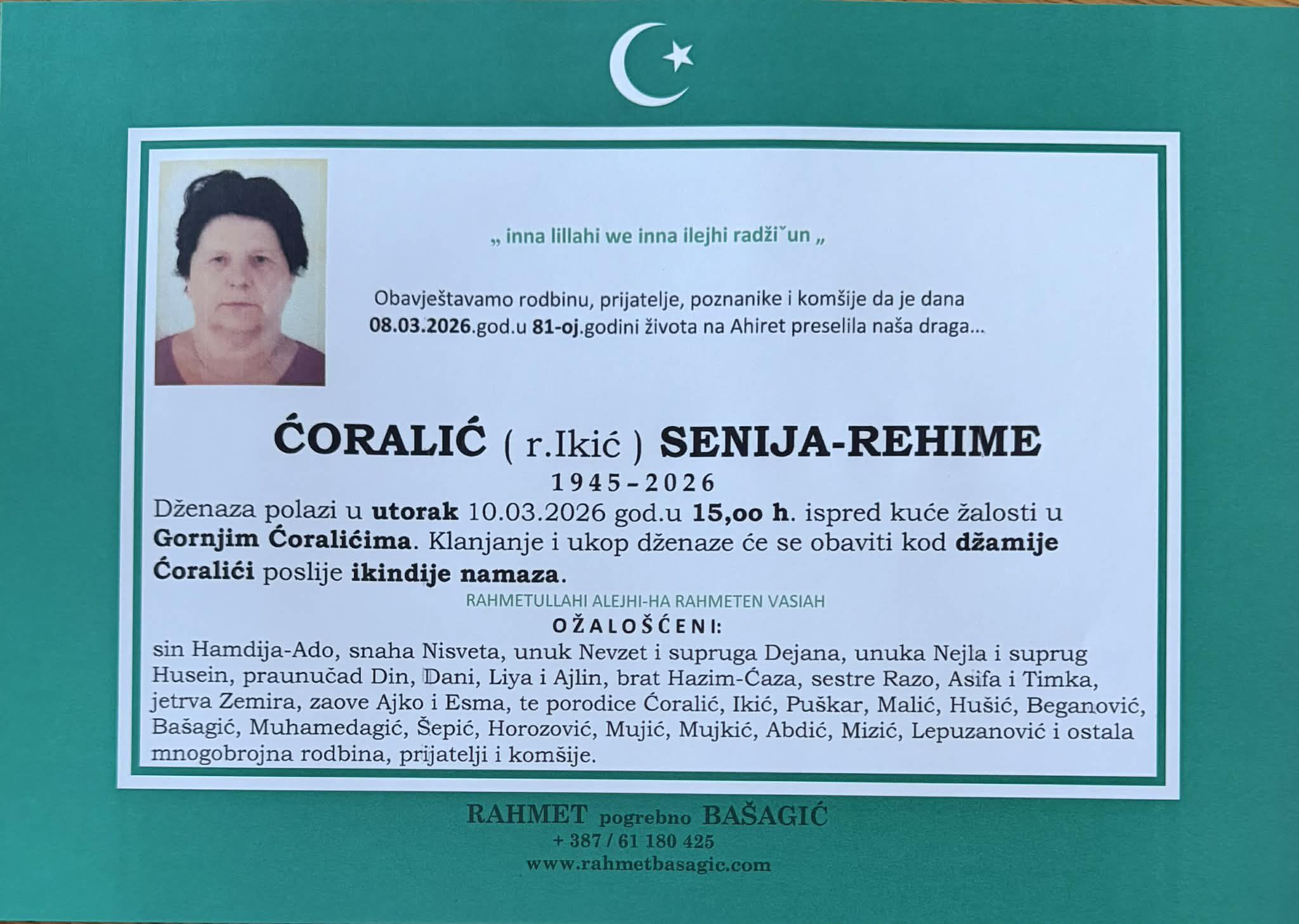 Dženaza polazi u utorak 10.03.2026 god.u 15,00 h. ispred kuće žalosti u Gornjim Ćoralićima. Klanjanje i ukop dženaze će se obaviti kod džamije