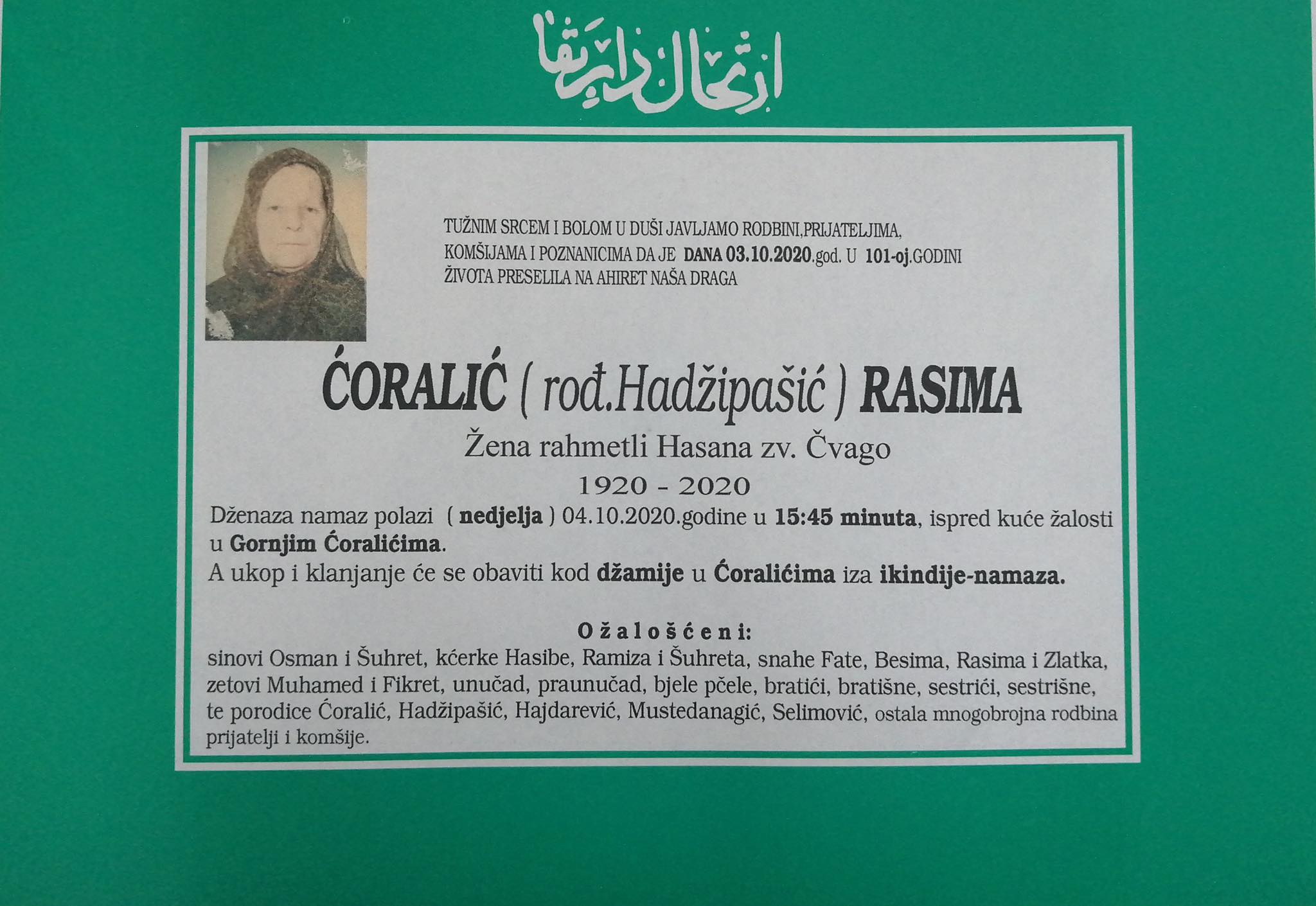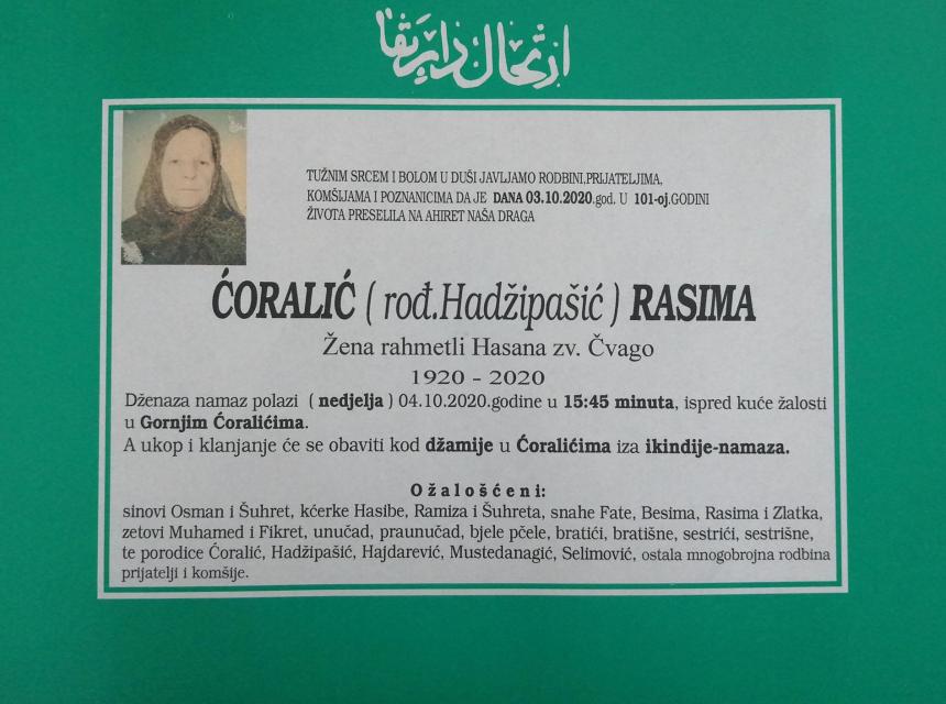 Tužnog srca i s bolom u duši obavještavamo rodbinu, komšije i prijatelje da je naša draga Ćoralić (rođ. Hadžipašić) Rasima preselila na Ahiret dana 3. oktobra 2020. godine u 101. godini života.
