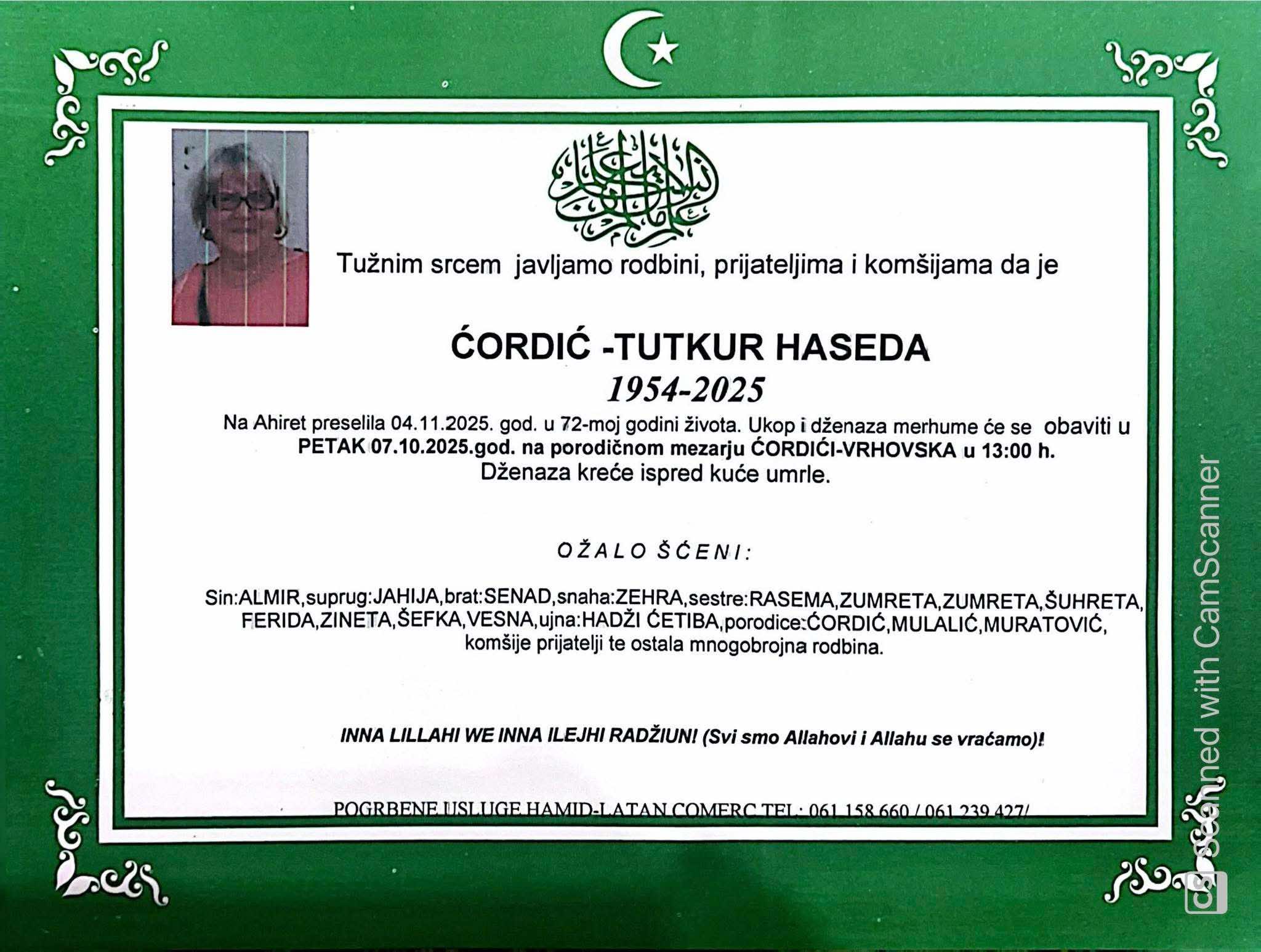 Tužnim srcem javljamo rodbini, prijateljima i komšijama da je ĆORDIĆ - TUTKUR HASEDA na Ahiret preselila 04.11.2025. god. u 72-moj godini života.
