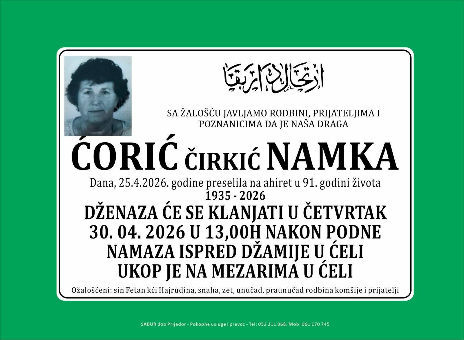 Dženaza će se klanjati u četvrtak 30.04.2026. u 13,00h nakon podne namaza ispred džamije u Ćeli.