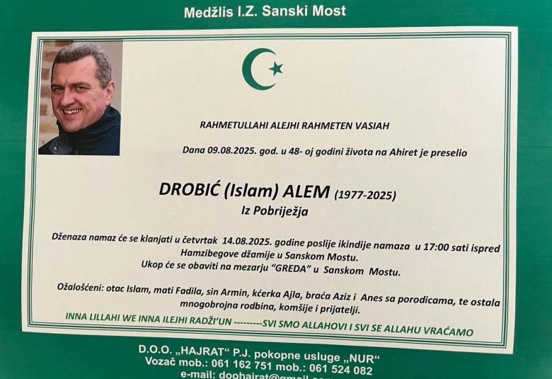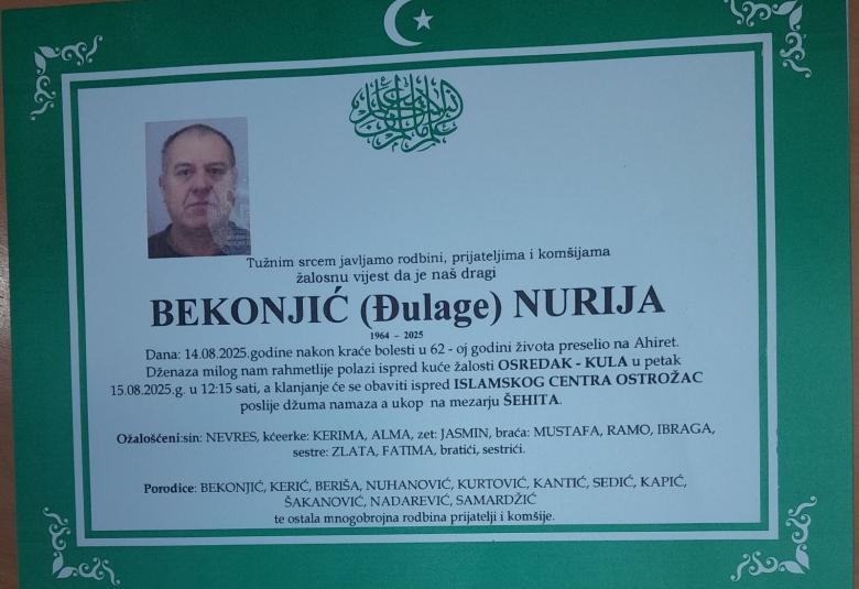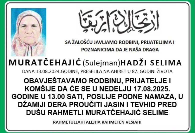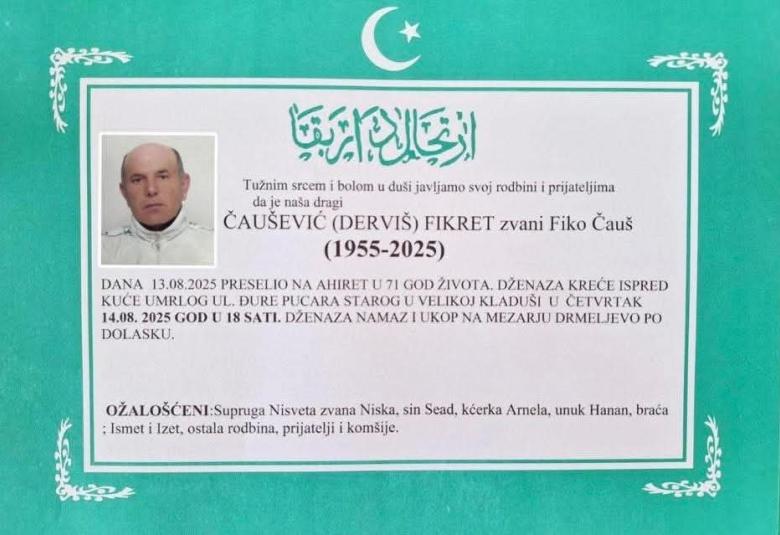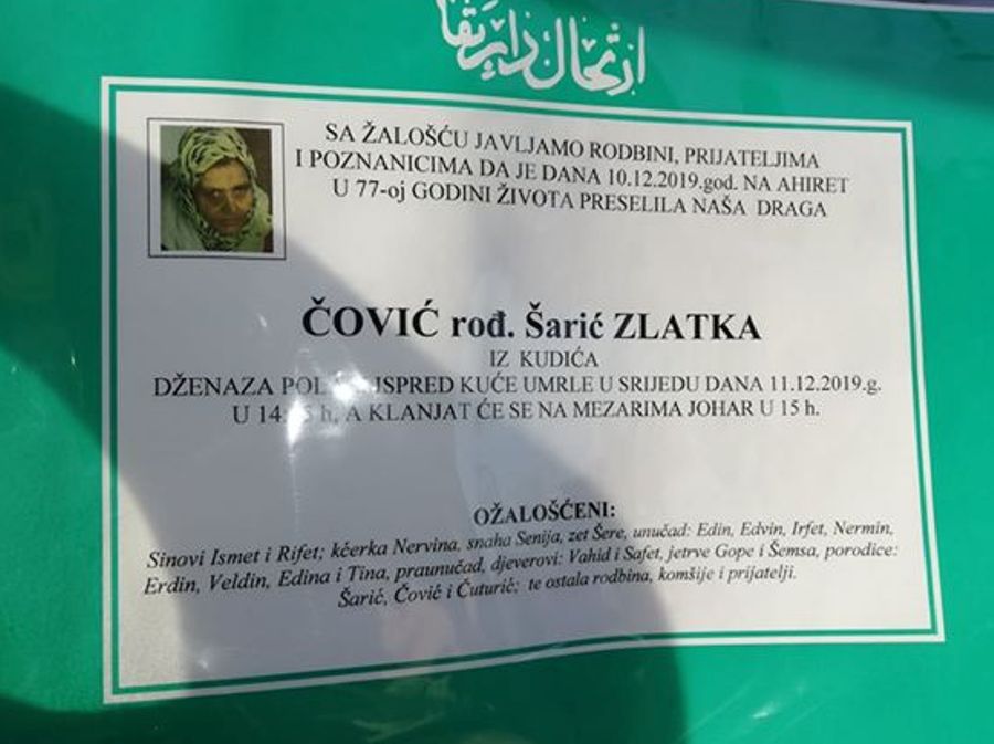Dženaza polazi ispred kuće umrle, 11.12.2019. godine (srijeda), a klanjati će se na mezarju Johar u 15:00h.
