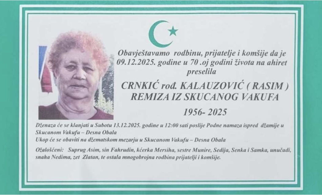 Dženaza će se klanjati u subotu 13.12.2025. godine u 12:00 sati poslije podne-namaza ispred džamije u Skucanom Vakufu – Desna Obala.