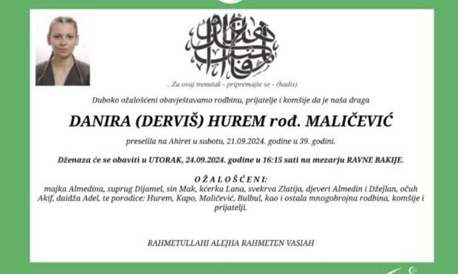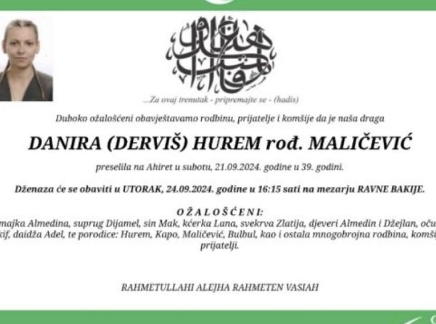 užnim srcem i bolom u duši javljamo rodbini, prijateljima i komšijama da je naša draga Danira (Derviš) Hurem rođ. Maličević, dana 21.09.2024. godine u 39-oj godini života, preselila na ahiret.