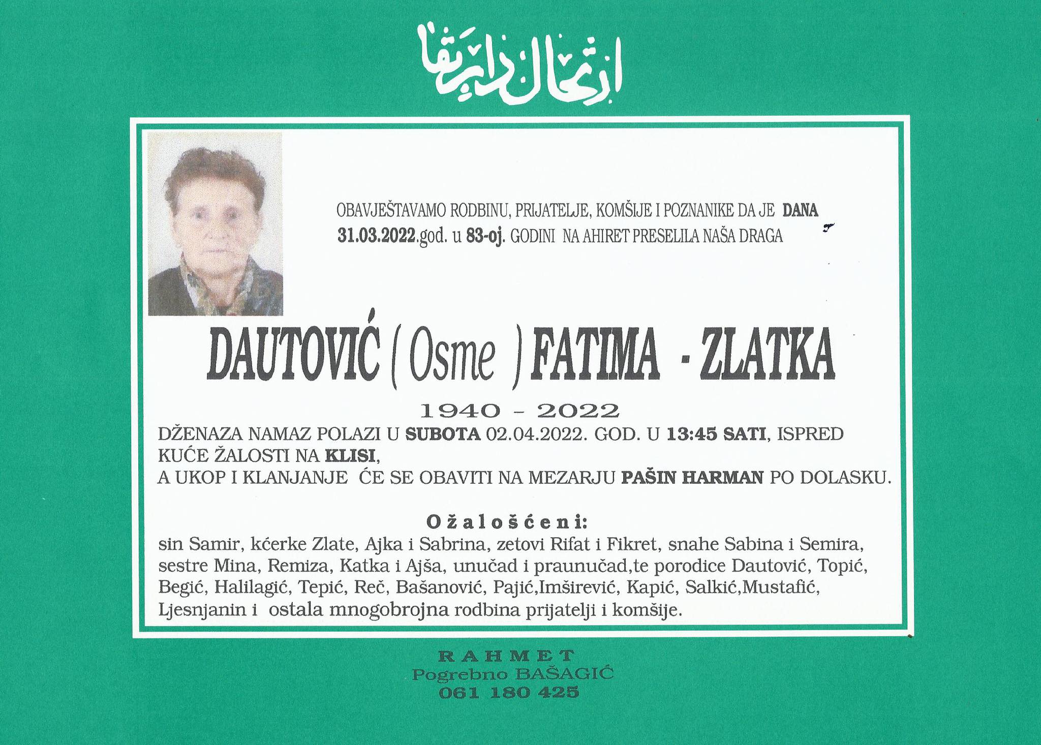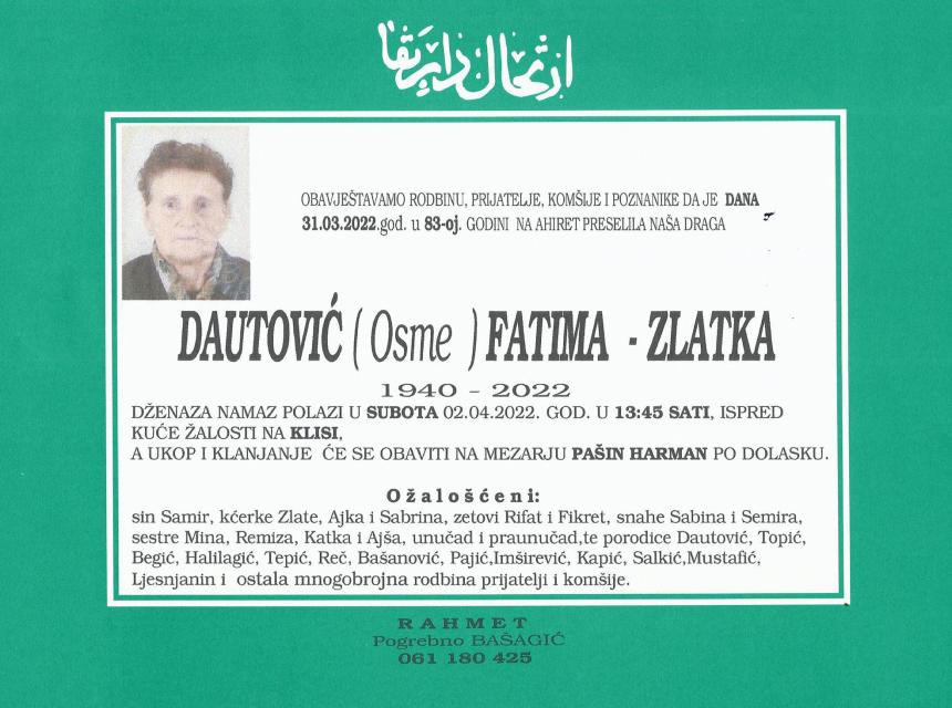 Tužnog srca i s bolom u duši obavještavamo rodbinu, komšije i prijatelje da je naša draga Dautović (Osme) Fatima-Zlatka, dana 31.03.2022. godine, u 83-oj godini života, preselila na Ahiret.