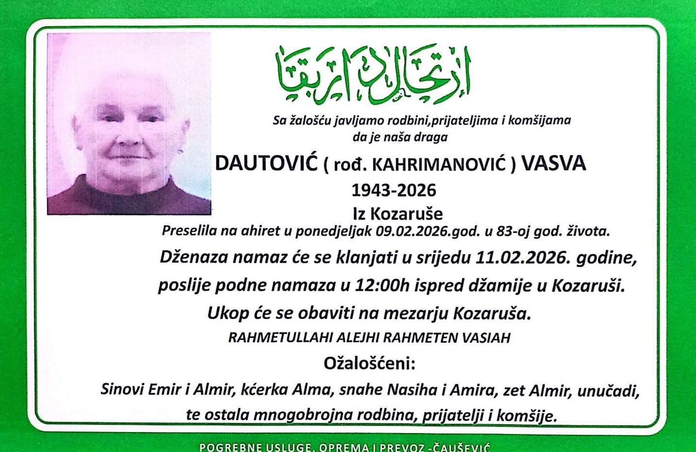 Dženaza-namaz će se klanjati u srijedu 11.02.2026. godine, poslije podne-namaza u 12:00 sati ispred džamije u Kozaruši.