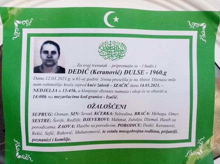 Tužnog srca i s bolom u duši obavještavamo rodbinu, komšije i prijatelje da je naša draga Dedić (Keranović) Đulse, dana 12.03.2021 godine, u 61-oj godini života, preselila na Ahiret.