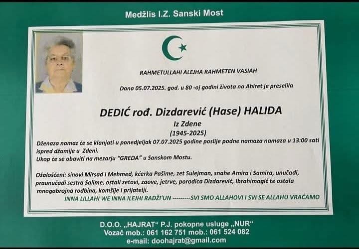 Tužnim srcem i bolom u duši javljamo rodbini, prijateljima i komšijama da je naša draga Dedić rođ. Dizdarević (Hase) Halida, dana 05.07.2025. godine u 80-oj godini života, preselila na Ahiret.