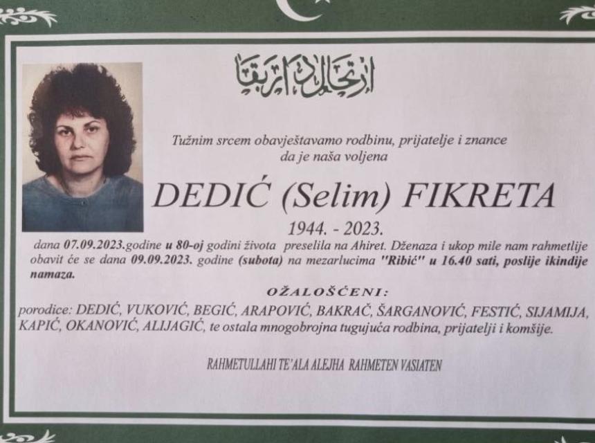 Tužnim srcem obavještavamo rodbinu, prijatelje i znance da je naša voljena DEDIĆ (Selim) FIKRETA dana 07.09.2023.godine u 80-oj godini života preselila na Ahiret.