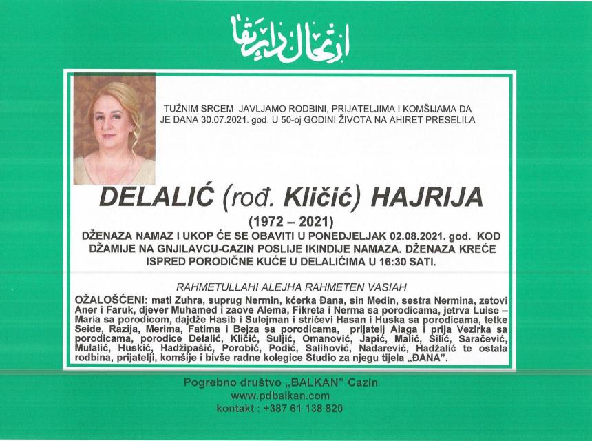 Tužnog srca i s bolom u duši obavještavamo rodbinu, komšije i prijatelje da je naša draga Delalić (rođ. Kličić) Hajrija, dana 30.07.2021 godine, u 50-oj godini života, preselila na Ahiret.